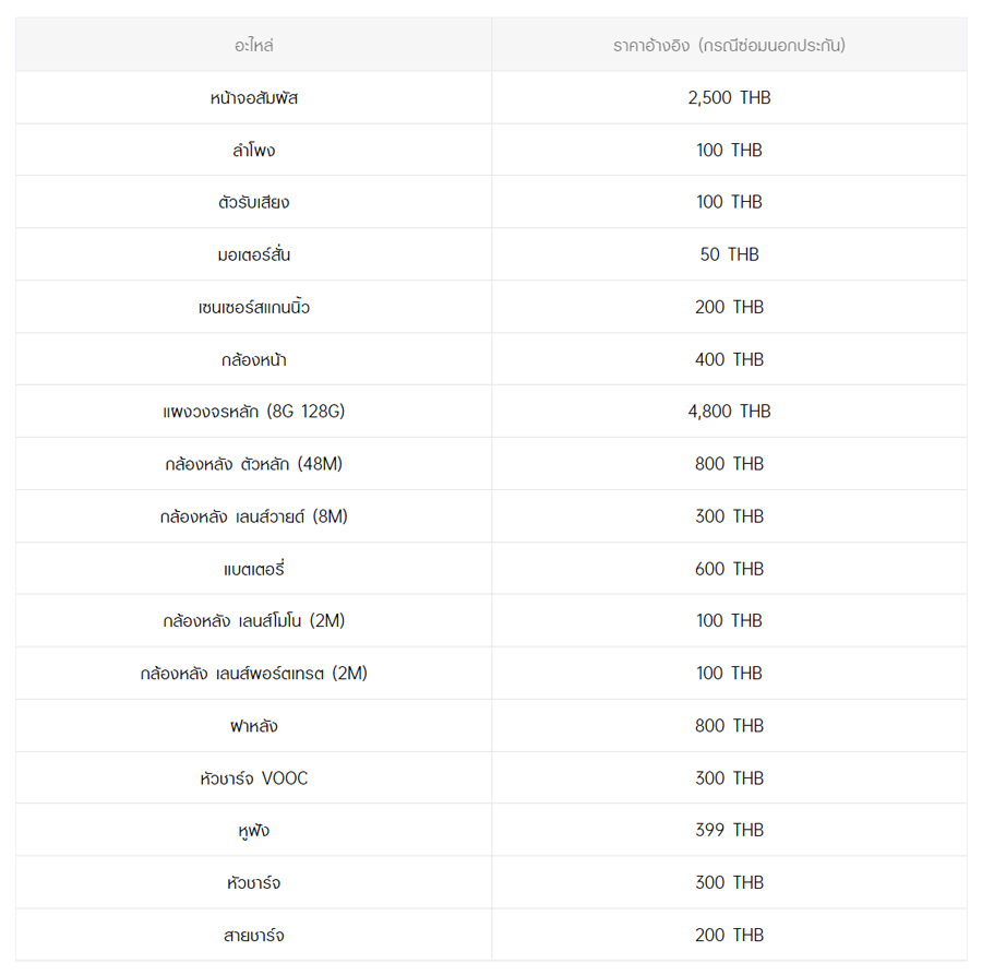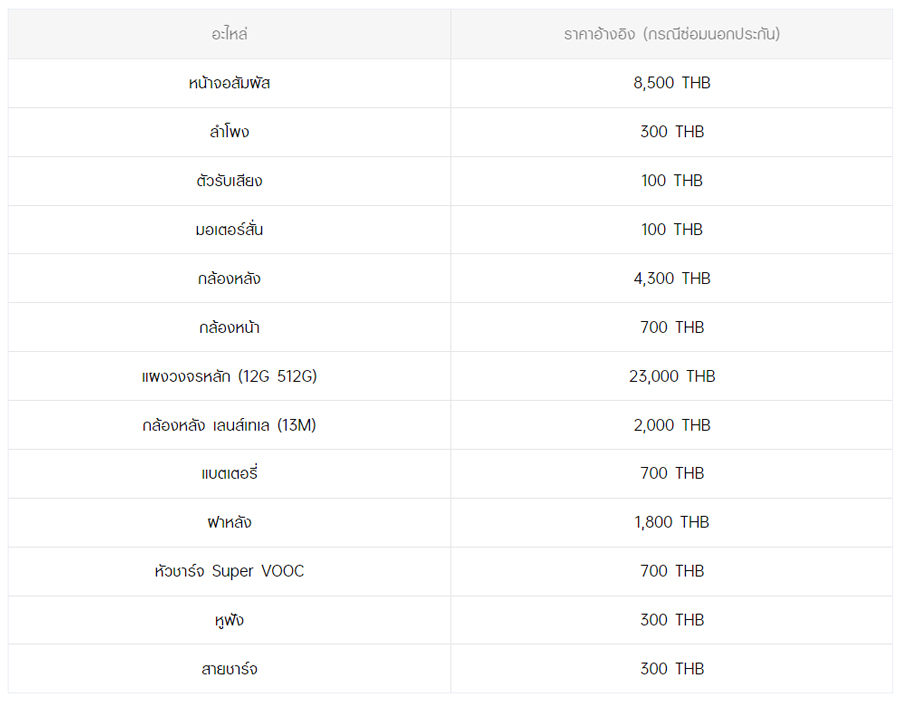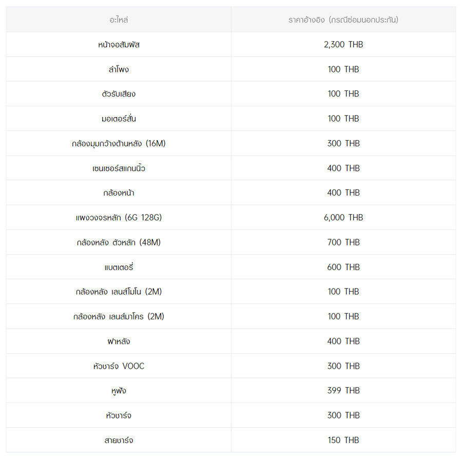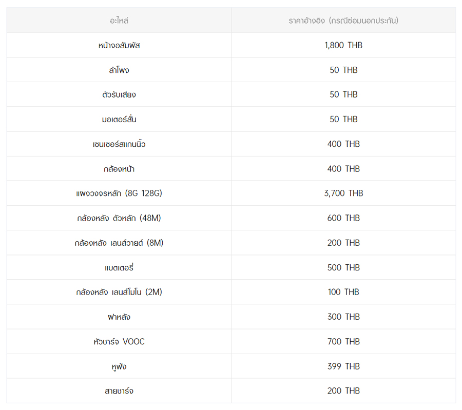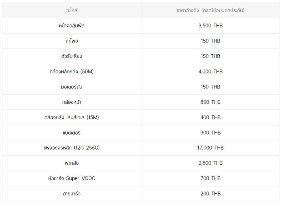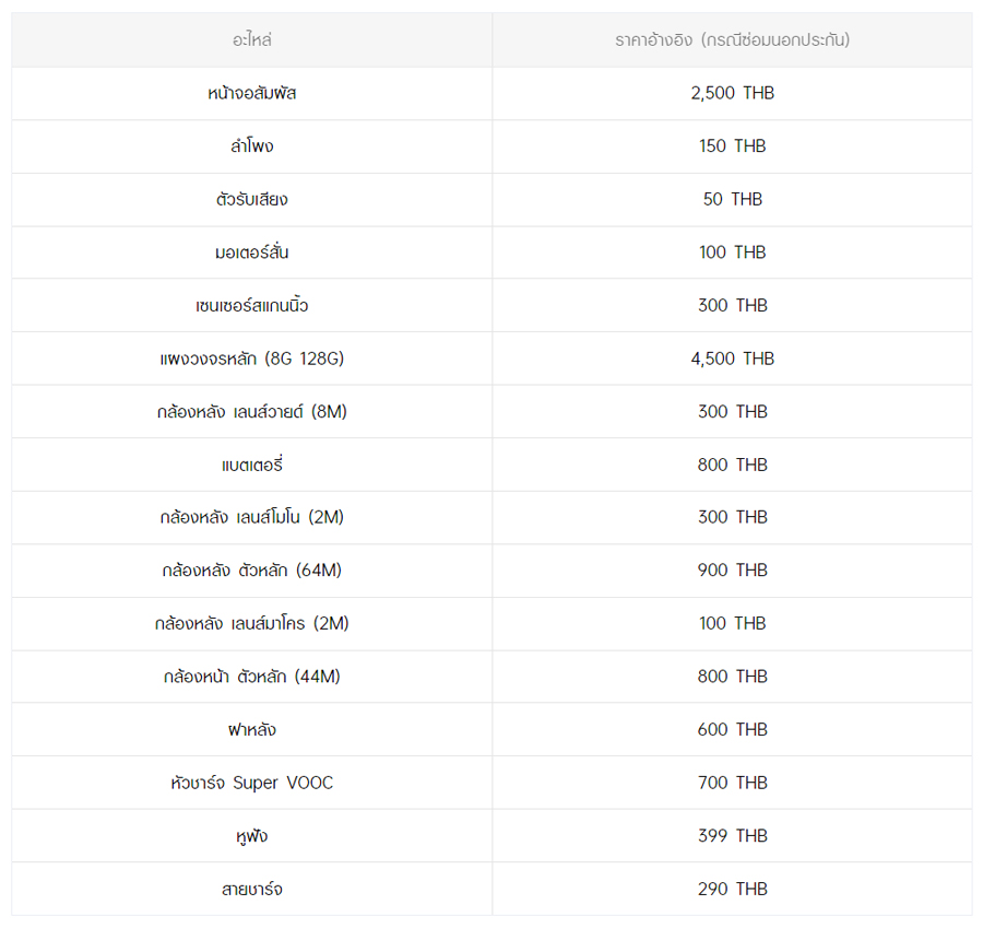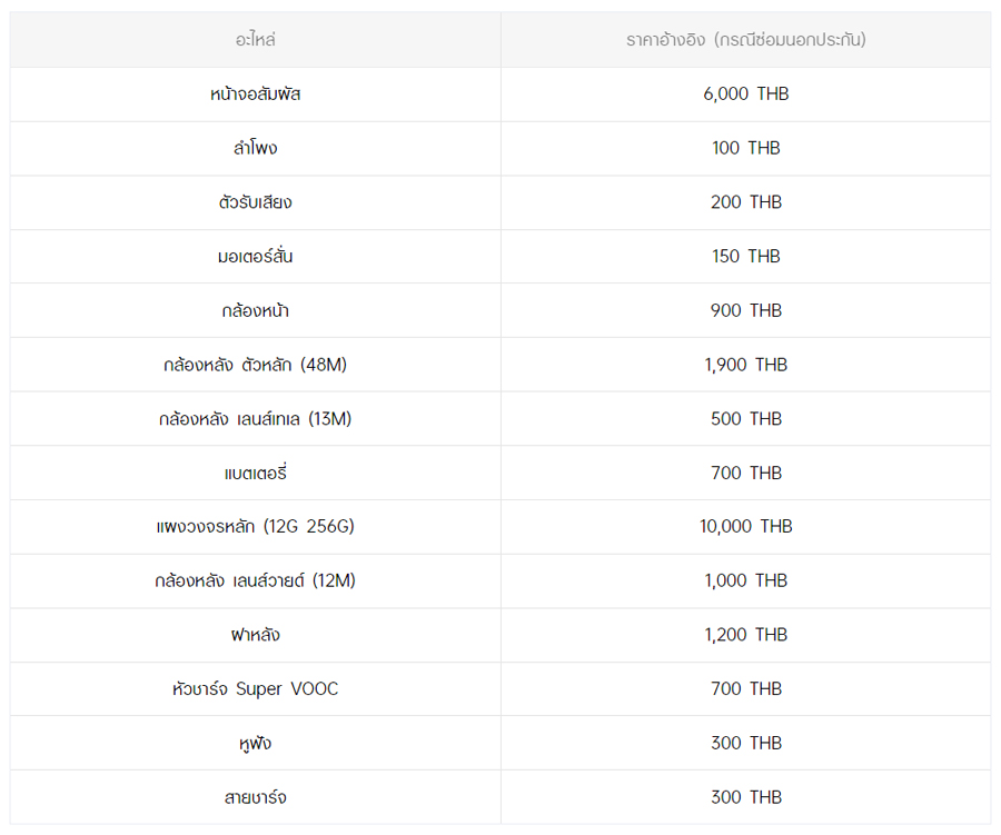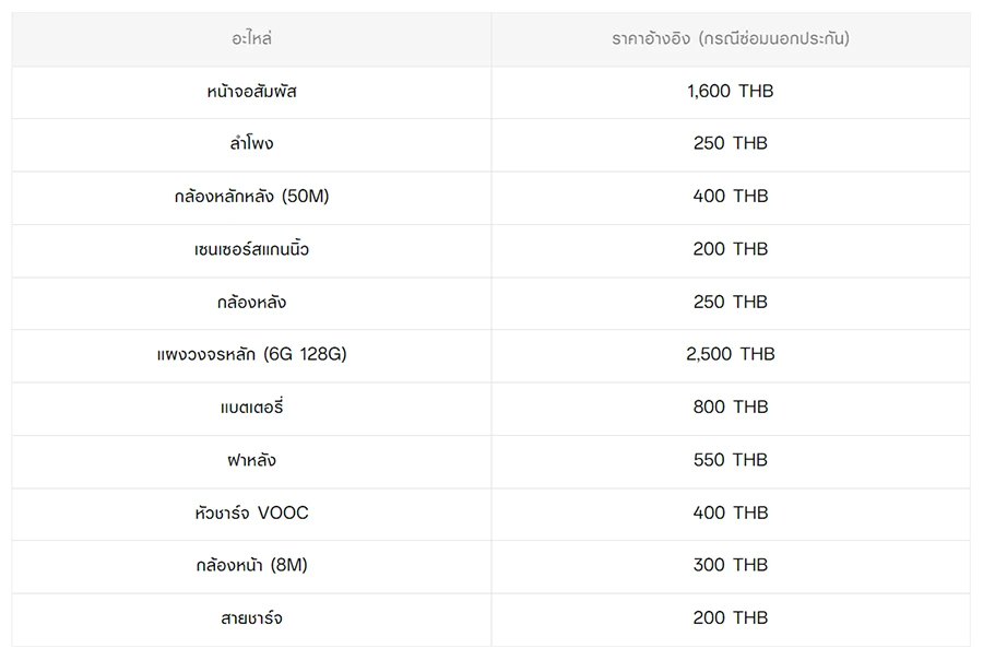 - หากต้องการทราบราคาในการซ่อมทั้งหมด สามารถสอบถามได้ ณ ศูนย์บริการออปโป้ หรือ OPPO Care