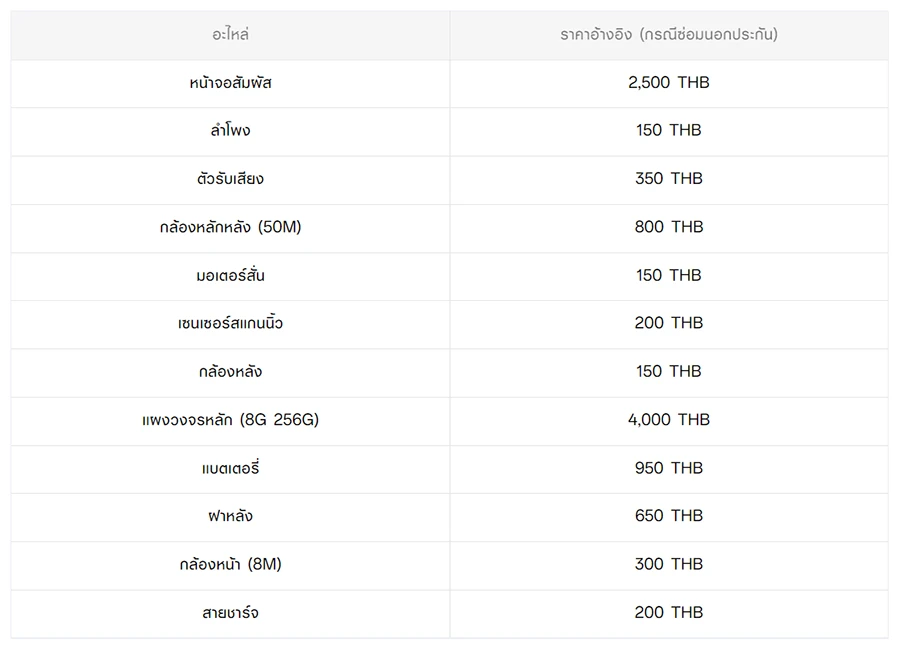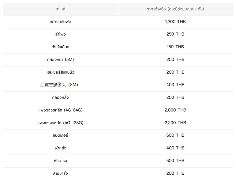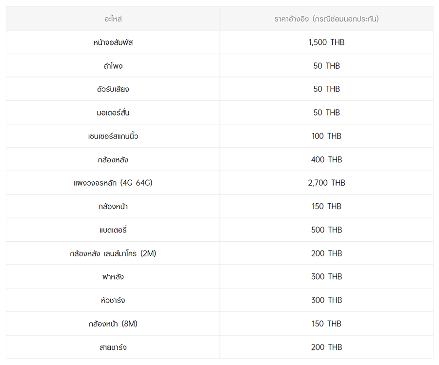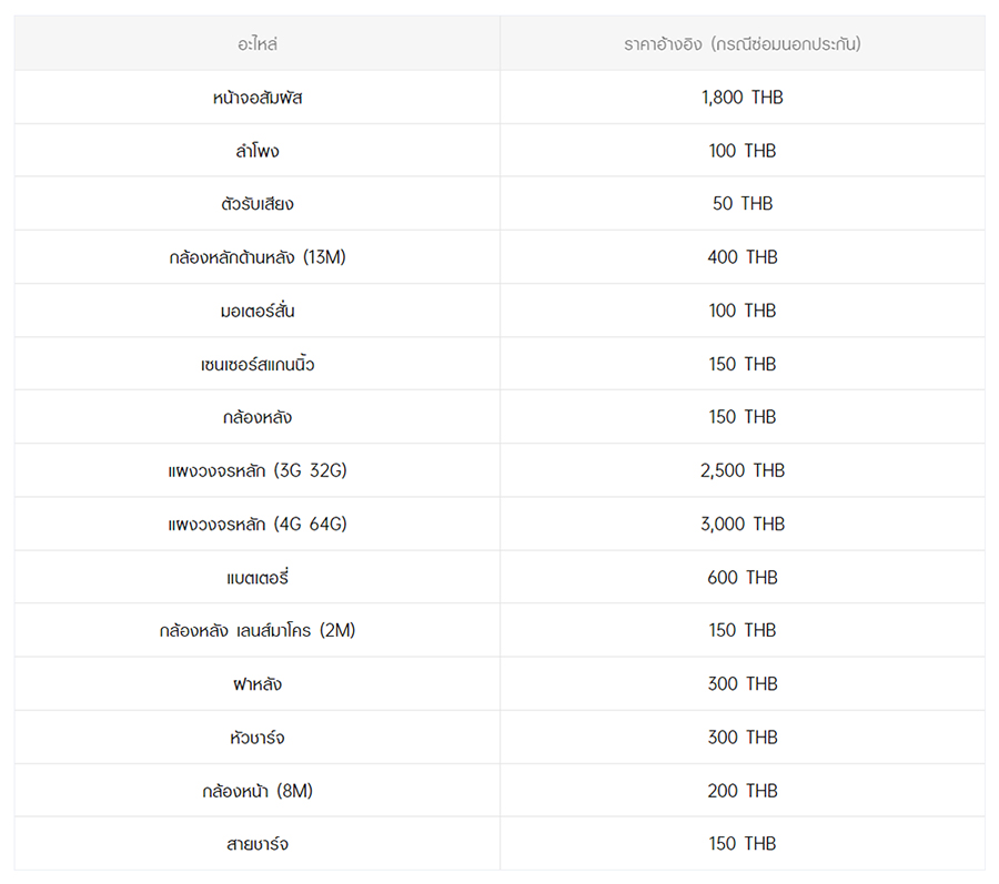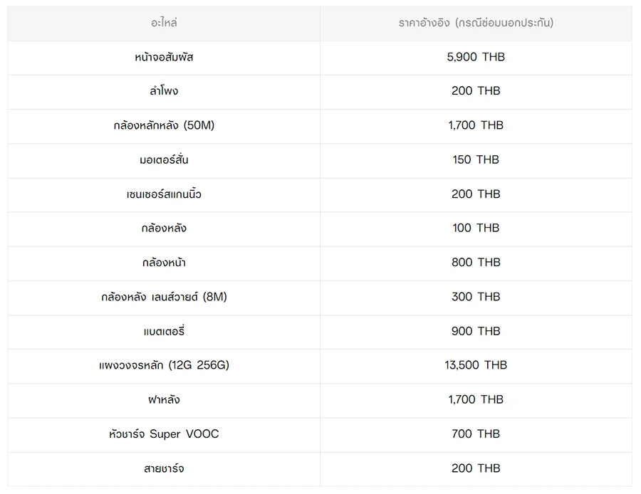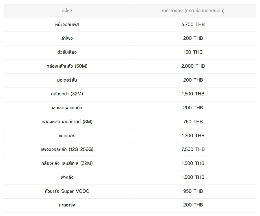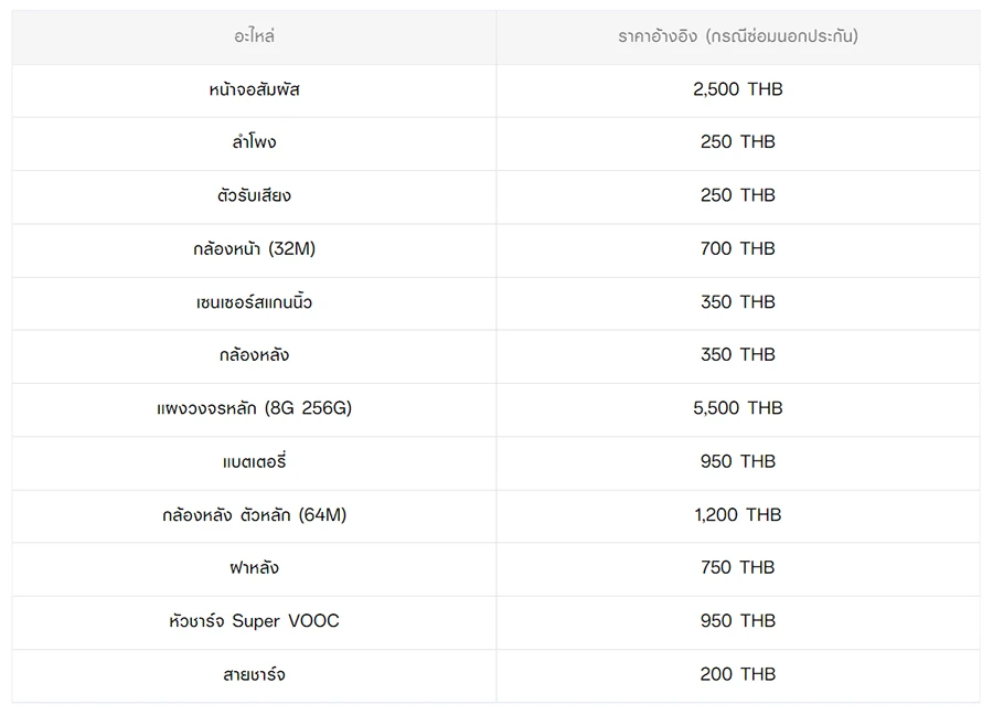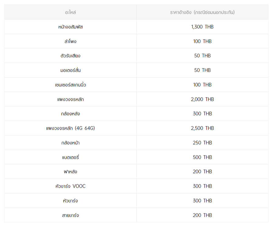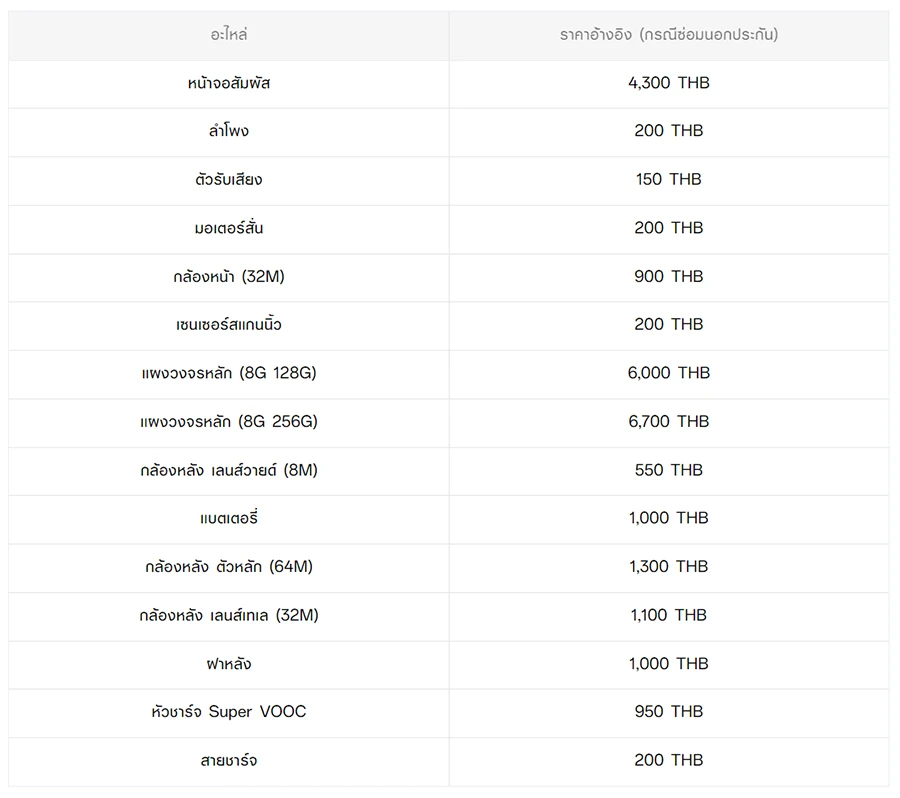 - หากต้องการทราบราคาในการซ่อมทั้งหมด สามารถสอบถามได้ ณ ศูนย์บริการออปโป้ หรือ OPPO Care