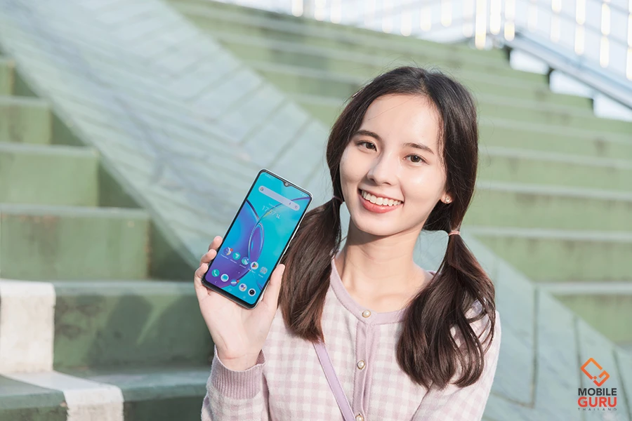 มิติตัวเครื่องกว้าง 76.17 x สูง 164.06 x หนา 8.07 มิลลิเมตร และมีน้ำหนักตัวเครื่องเบาเพียง 190 กรัม ส่วนด้านหน้าตัวเครื่องมาพร้อมหน้าจอแสดงผล Sunlight แบบ IPS LCD ขนาด 6.64 นิ้ว ความละเอียดระดับ Full HD+ (2,388 x 1,080 พิกเซล) อัตรา Refresh Rate 60Hz ความสว่างหน้าจอสูงสุด 600 nits ให้สีสันสวยงาม คมชัด ใช้งานได้ดีแม้ในที่แสงจ้าค่ะ มีรอยบากทรงหยดน้ำสำหรับวางกล้องหน้าความละเอียด 8MP (f/2.0) พร้อมขอบจอบาง ทำให้สามารถเสพคอนเทนต์ต่างๆ ได้กว้างเต็มตากว่า