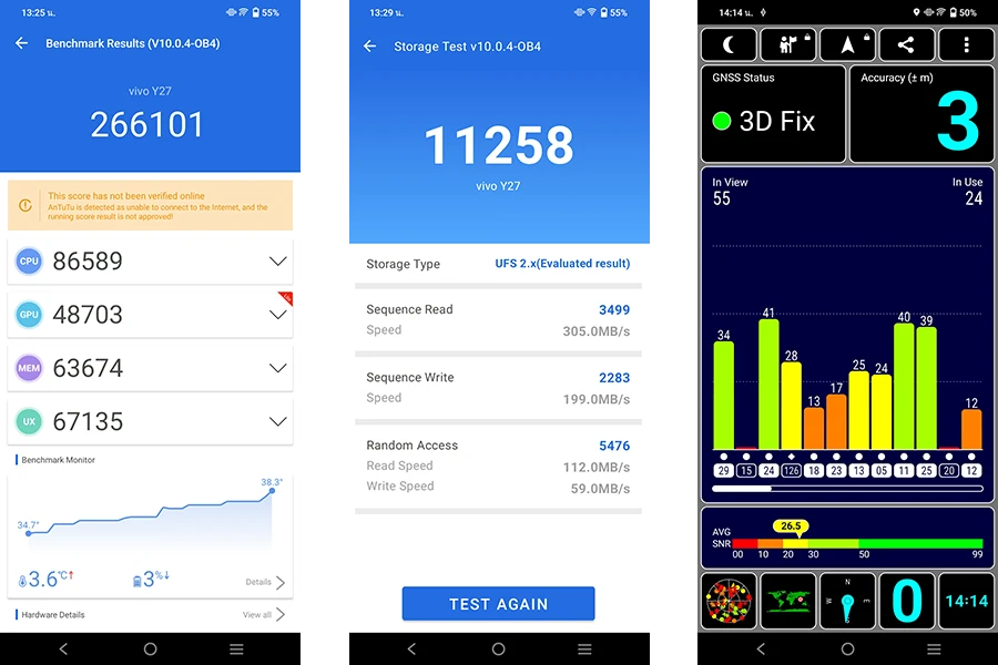 • ทดสอบประสิทธิภาพการทำงานด้วยแอปพลิเคชัน AnTuTu Benchmark ได้คะแนนรวม 266,101 คะแนน