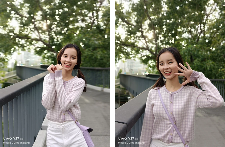vivo Y27 5G มาพร้อมกล้องหลังเลนส์คู่ ประกอบด้วย เลนส์หลักความละเอียด 50MP ค่ารูรับแสงกว้าง f/1.8 ให้ภาพที่สวยงาม คมชัด พร้อมเก็บรายละเอียดต่างๆ โดยทำงานร่วมกับเลนส์ Bokeh ความละเอียด 2 ล้านพิกเซล ค่ารูรับแสงกว้าง f/2.4 สำหรับการสร้างเอฟเฟกต์โบเก้ให้บุคคลในภาพดูโดดเด่น มีไฟแฟลช LED ในตัว โดยมาพร้อมด้วยโหมดถ่ายภาพให้เลือกสนุกหลากหลาย ไม่ว่าจะเป็น 50MP, Bokeh Flare Portrait, Double Exposure, Night และอื่นๆ ส่วนด้านหน้ามาพร้อมกล้องความละเอียด 8MP ค่ารูรับแสงกว้าง f/2.0 ให้คุณภาพและคาแรคเตอร์ของภาพถ่ายที่สวยงามตามแบบฉบับของวีโว่เหมือนเคย