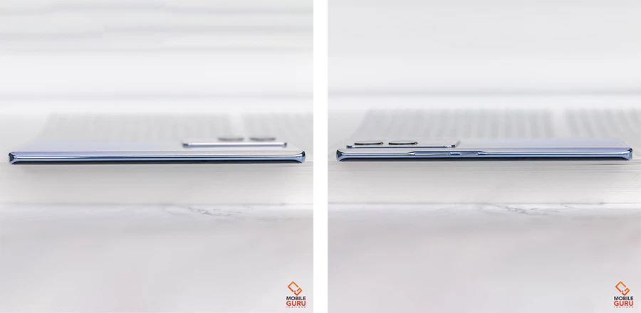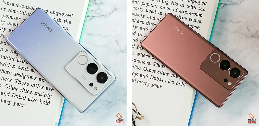 ในวันนี้ เรานำมาให้ชมกัน 2 สี คือ สีม่วง Starry Purple และสีแดงเข้ม Magic Maroon ค่ะ ผิวสัมผัสของตัวเครื่องทั้งสองสีมีความเรียบลื่น โดยสีม่วงจะเรียบและมันวาวแบบ Glossy ในขณะที่สีแดงเข้มจะเรียบแบบ Matte ด้านหลังมีโลโก้ vivo สีเงินติดอยู่ที่มุมล่างซ้ายของตัวเครื่อง ส่วนด้านบนซ้ายติดตั้งโมดูลเลนส์ที่ถูกออกแบบอย่างประณีต ดีไซน์ให้สีกลมกลืนกับสีของฝาหลัง ตกแต่งด้วยกรอบวัสดุโลหะเกรดเดียวกับในอุตสาหกรรมอวกาศ พร้อมขอบเครื่องบางเพียง 2.4 มิลลิเมตร ให้ภาพรวมของตัวเครื่องที่ดูสวยงามและโฉบเฉี่ยว