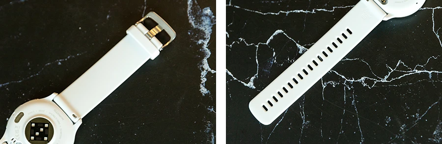 ด้านหลังของ Garmin Venu 3 มาพร้อม Garmin Elevate เซนเซอร์เวอร์ชันใหม่ล่าสุดซึ่งเป็นเวอร์ชันที่ 5 แล้วของการ์มิน ที่ช่วยให้สามารถจับวัดค่าต่าง ๆ ได้แม่นยำมากขึ้น และยังช่วยซัพพอร์ตในฟีเจอร์ใหม่อย่างโค้ชการนอน (Sleep Coach) อีกด้วย และด้านข้างสายนาฬิกาจะเป็นพอร์ตชาร์จ โดยในส่วนของสายนาฬิกายังสามารถถอดเปลี่ยนได้ง่ายมาก ๆ