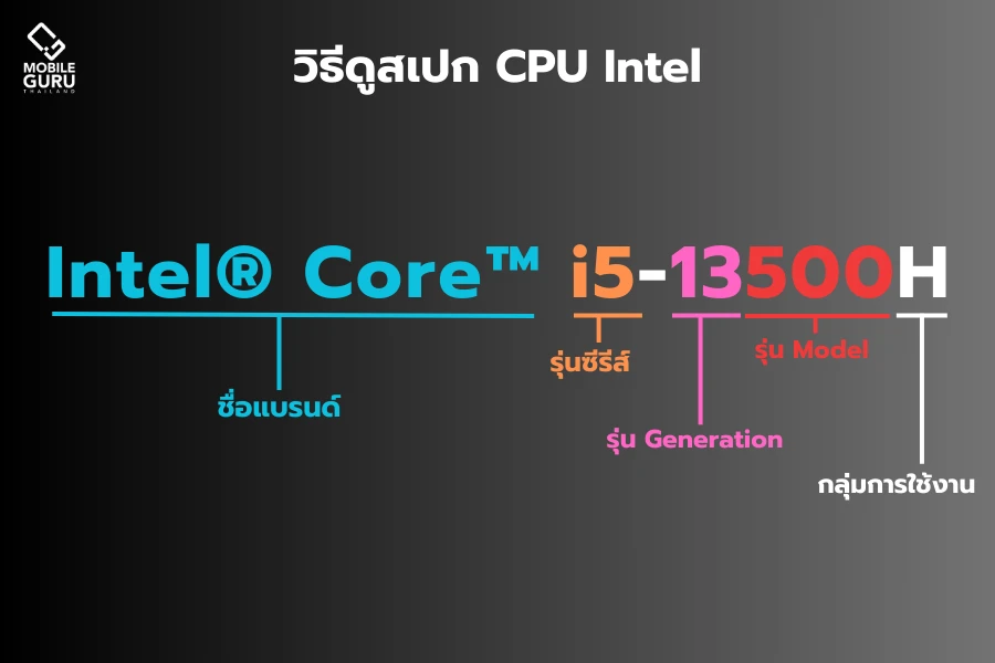 - (สีชมพู) เลขข้างหน้า 13 : เป็น Generation ของ CPU โดยปีปัจจุบันตอนนี้ 2023 CPU Intel Generation ที่ 13 เป็นรุ่นใหม่ล่าสุด หากเป็นรุ่นที่เก่าลงไปก็จะเป็นเลข 12, 11, 10 ลงไป ตัวอย่างเช่น Intel Core i5-13500H ก็จะใหม่กว่า Intel Core i5-12500H
