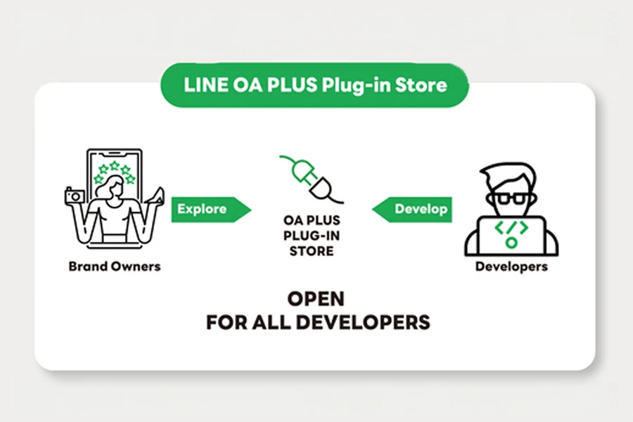 LINE OA Plus Plug-in Store เป็นการพัฒนาต่อยอดจาก LINE OA Store เพื่อเป็นช่องทางให้นักพัฒนาภายนอกองค์กรสามารถพัฒนาโซลูชันใหม่ ๆ เฉพาะด้าน เพื่อเพิ่มศักยภาพให้กับกลุ่มเครื่องมือภายใต้ LINE OA Plus ไม่ว่าจะเป็น MyShop, MyCustomer และ MyRestaurant โดยทำหน้าที่เป็นแหล่งรวมและนำเสนอให้กับนักการตลาดหรือแบรนด์ที่มองหาโซลูชันให้ตรงกับความต้องการ