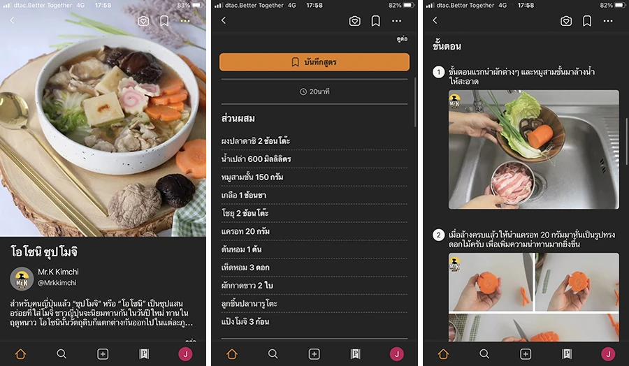 โดยในแต่ละเมนู ถ้าถูกใจ เราสามารถเลือกกดบันทึกสูตรเก็บไว้เพื่อดูย้อนหลังได้ รวมไปถึง แชร์ พิมพ์ ส่ง Cooksnap หรือเพิ่มลงใน Cookbook ของเราเองก็ได้