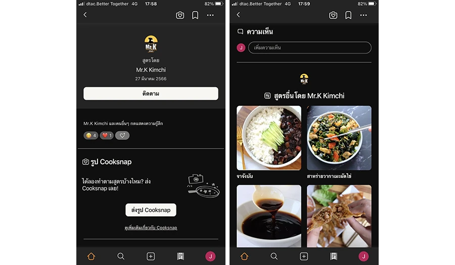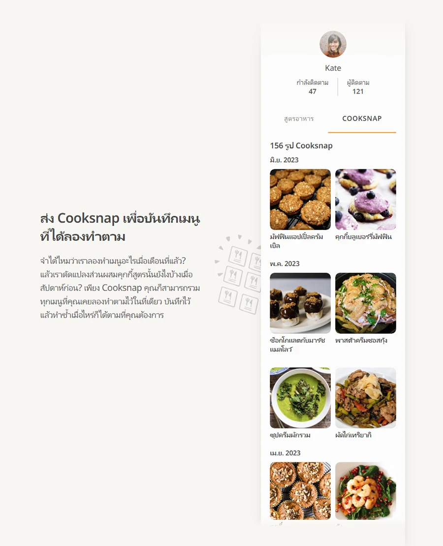 นอกจากนี้ การส่ง Cooksnap ยังเป็นการบันทึกเมนูที่เราได้ลองทำตาม ซึ่งในหน้า Profile ของเรา จะมีการรวมทุกเมนูที่เคยลองทำตามไว้ในที่เดียว โดยบันทึกไว้แล้วทำซ้ำเมื่อไหร่ก็ได้ตามที่ต้องการ