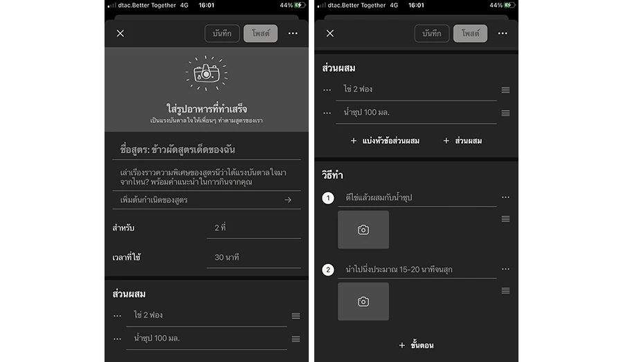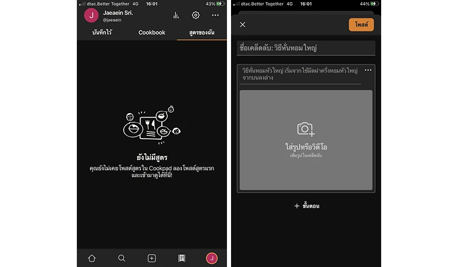 นอกจากการทดลองทำตามสูตรของคนอื่นแล้ว หากเรามีสูตรเด็ดหรือเคล็ดลับต่าง ๆ ก็สามารถร่วมแชร์ในคอมมูนิตี้ของ Cookpad ได้เลย ซึ่งหน้าตาการใช้งานก็อย่างที่บอกไปเลยค่ะว่าใช้ง่ายมากๆ มีการแบ่งพาร์ทชัดเจน เรียกได้ว่าง่ายทั้งคนแชร์สูตรและคนที่กำลังตามหาสูตรเลย