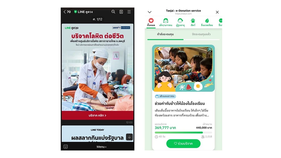 นอกจากจะโดดเด่นที่บริการดูดวงจากนักพยากรณ์ชื่อดังและบริการขอพรแก้บน แล้วนั้น LINE ดูดวง ก็จับมือกับ "เทใจ" แพลตฟอร์มระดมทุนเพื่อสังคมชื่อดังของไทย ที่ร่วมกันพัฒนาฟีเจอร์ "บริจาคเงิน" เพื่อเด็ก คนชรา และสิ่งแวดล้อม พร้อมอัปเดตความคืบหน้าของโครงการต่าง ๆ หลังบริจาค ซึ่งล่าสุดก็กำลังดำเนินการระดมทุนเงินบริจาคเพื่อสร้างห้องความดันลบ ARI โรงพยาบาลเด็ก ยิ่งทำให้ผู้ใช้ LINE เข้าถึงการมีส่วนร่วมในการช่วยเหลือสังคมมากขึ้นกว่าที่เคย ดูรายละเอียดเพิ่มเติมได้ที่ taejai.com/th/line/d/all