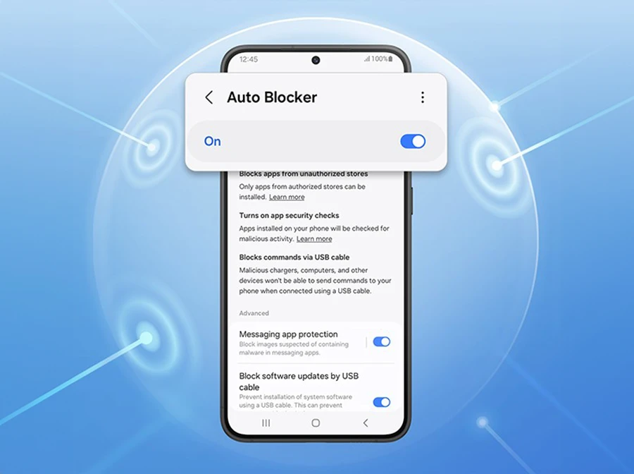 Auto Blocker (ตัวบล็อกอัตโนมัติ) เป็นฟีเจอร์ความปลอดภัยใหม่ของซัมซุงที่สร้างขึ้นมาเพื่อความปลอดภัยของผู้ใช้งาน Samsung Galaxy ป้องกันการโจมตีทางไซเบอร์ โดยเฉพาะการโจรกรรมประเภท Side Loading ซึ่งเป็นการติดตั้งซอฟต์แวร์หรือแอปพลิเคชันจากแหล่งดาวน์โหลดอื่นที่ไม่ได้รับอนุญาต เพื่อป้อนคำสั่งเจาะเข้าเครื่อง ผ่านรูปแบบต่าง ๆ เช่น SMS ที่ส่งมาพร้อมกับลิงก์ หรือแอปพลิเคชันแชทต่าง ๆ และการดาวน์โหลดแอปที่ไม่ได้มาจาก Play Store หรือ Galaxy Store ซึ่งอาจมีมัลแวร์แฝงมาด้วย