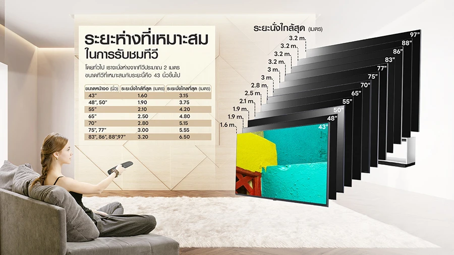 ใครที่มีแผนกำลังมองหาทีวีเครื่องใหม่ที่มีขนาดหน้าจอเหมาะสมกับพื้นที่ของห้อง ก็อย่าลืมพิจารณาจากระยะห่างในการรับชมที่เหมาะสมและเลือกขนาดของจอทีวีที่ใช่ให้เหมาะกับลักษณะของห้องนั่งเล่นของตัวเอง ซึ่งทีวีแอลจีก็มีขนาดหน้าจอที่หลากหลายตั้งแต่ 43 นิ้ว จนถึง 97 นิ้ว ให้เลือกใช้ได้ตามความเหมาะสมกับพื้นที่ในห้องนั่งเล่น