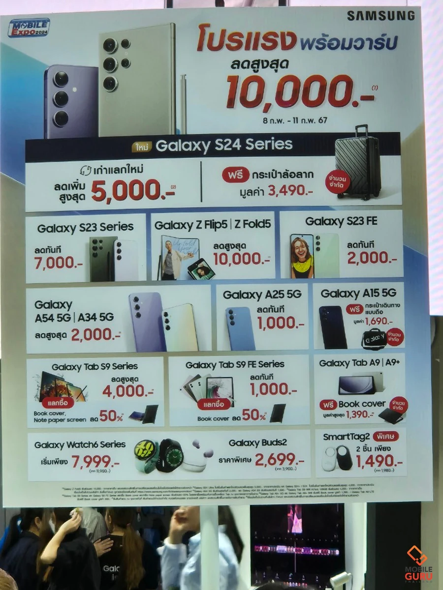- สำหรับลูกค้าที่ซื้อ Galaxy S24 Series ภายในงาน รับฟรีทันทีกระเป๋าล้อลากมูลค่า 3,490 บาท 1 ใบ (จำนวนจำกัด)