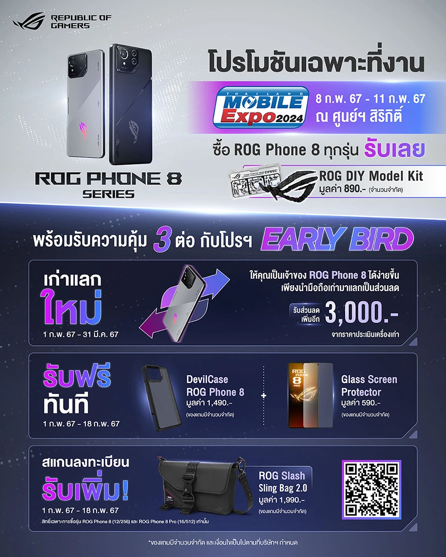 สาวกเกมมิ่งโฟนห้ามพลาด! กับสมาร์ตโฟน Gaming รุ่นใหม่จาก ROG อย่าง ASUS ROG Phone 8 และ ROG Phone 8 Pro ที่มาพร้อมโปรโมชันพิเศษเฉพาะงาน Thailand Mobile Expo 2024 รับฟรี! ไอเทมสุดลิมิเต็ด ROG DIY Model Kit มูลค่า 890 บาท (จำนวนจำกัดและไม่มีจำหน่ายแยก) เมื่อซื้อ ROG Phone 8 ทุกรุ่น ในวันที่ 8 - 11 ก.พ. 67 ที่ศูนย์ประชุมแห่งชาติสิริกิติ์