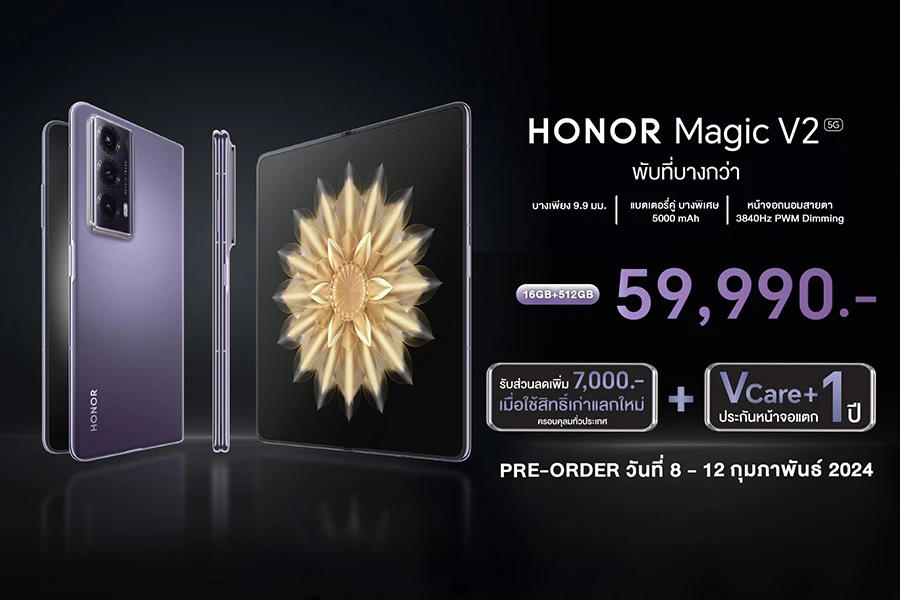 ออเนอร์ กับสมาร์ตโฟนจอพับ HONOR Magic V2 ที่มาพร้อมสโลแกน 'พับที่บางกว่า' เปิดตัวสดๆ ร้อนๆ ก่อนเริ่มงานเพียงวันเดียวเท่านั้น! เรียกได้ว่ายังอยู่ในช่าวง Pre-order แต่ก็สามารถมาสัมผัสตัวจริงกันที่งาน Thailand Mobile EXPO 2024 นี้ได้เลย