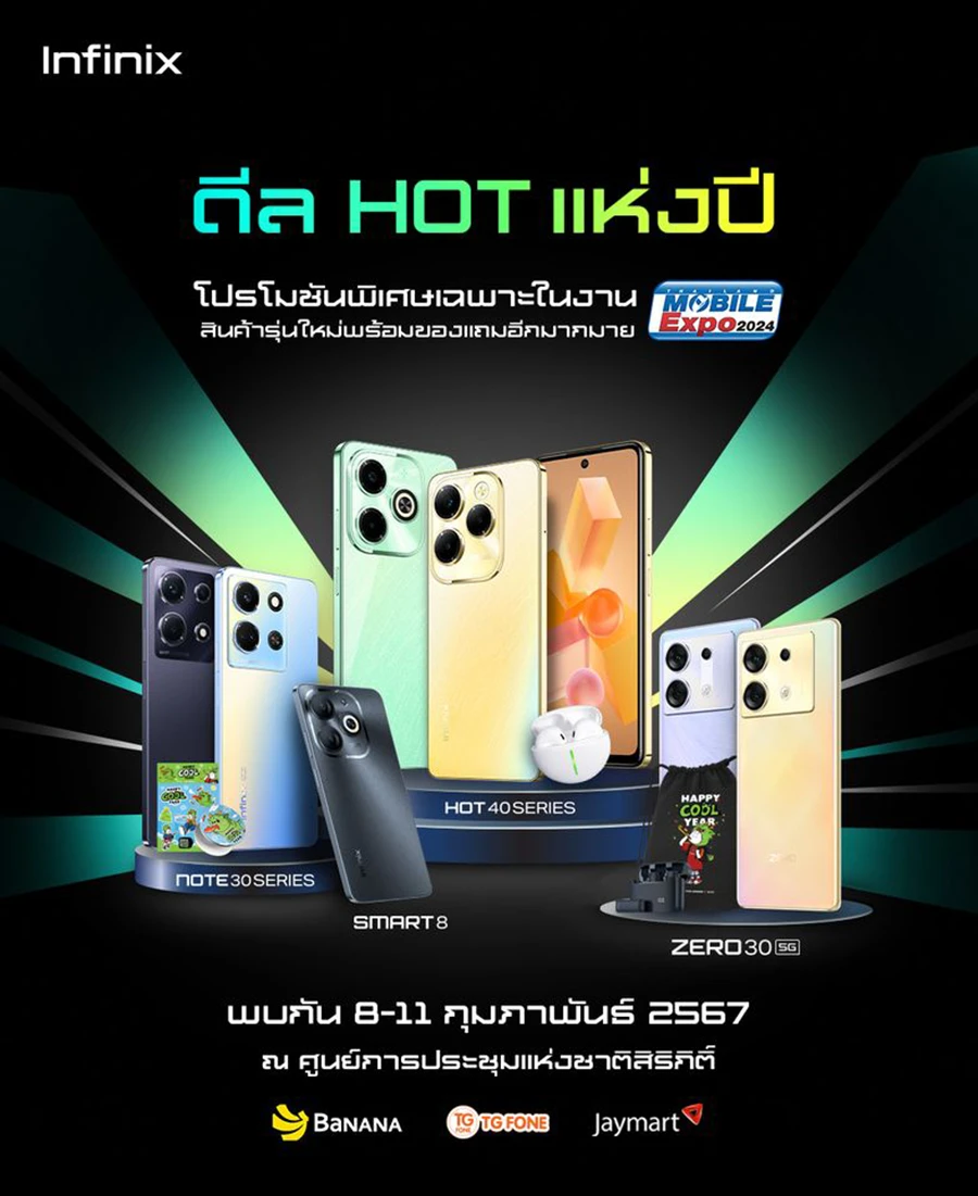 ดีลฮอตๆ กับมือถือสุด HOT รุ่นใหม่ล่าสุดจาก Infinix อย่าง Infinix Hot 40 Pro และ Infinix Hot 40i ภายในงาน Thailand Mobile EXPO 2024 ที่จับมือร่วมกับพาร์ทเนอร์อย่าง BaNANA, TG Fone และ Jaymart จัดเต็มโปรโมชันและของแถมพิเศษมากมายมาให้ลูกค้าในงานนี้โดยเฉพาะ!
