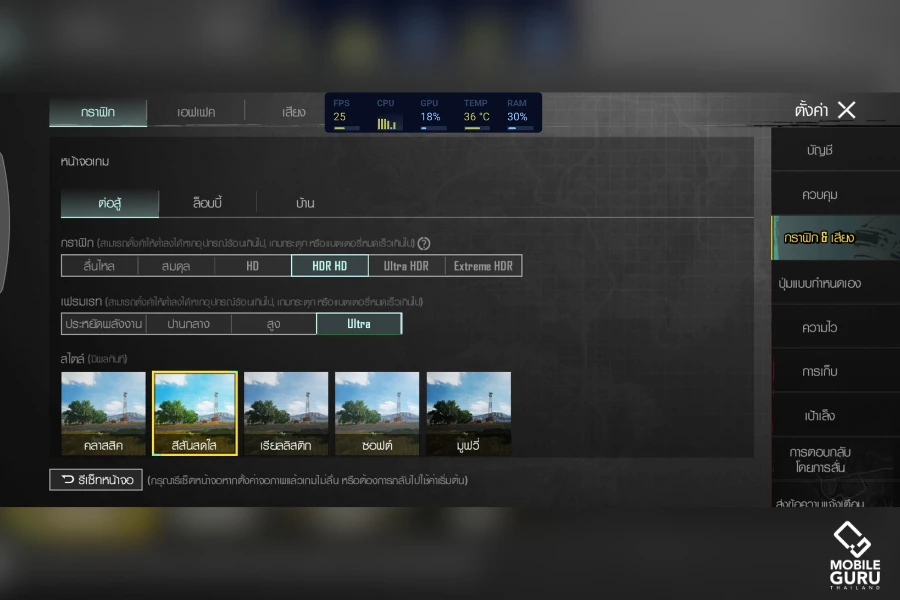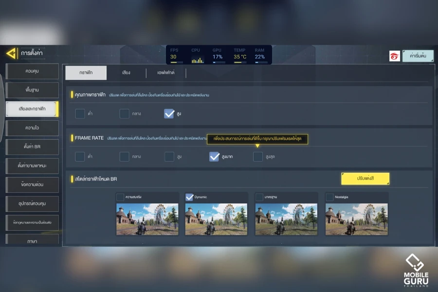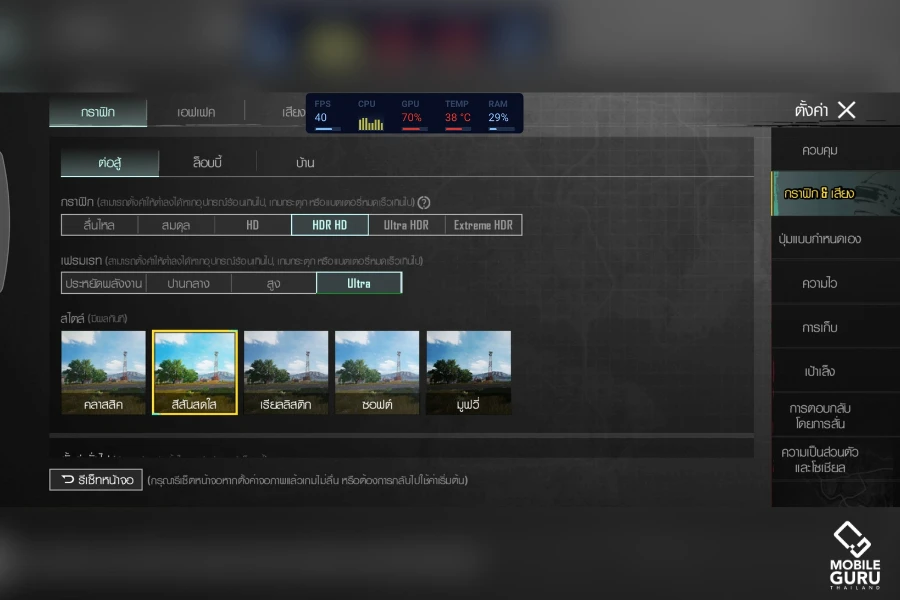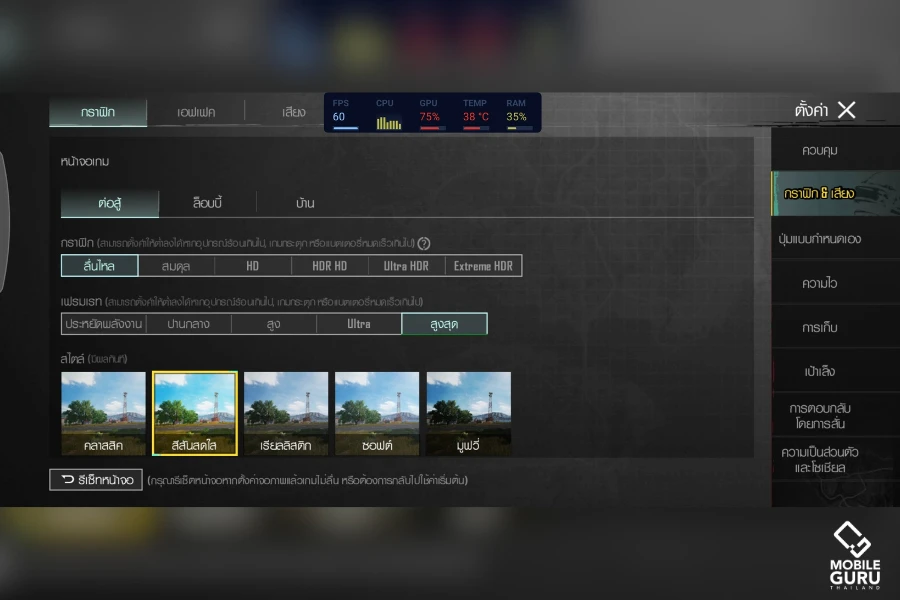 สำหรับการทดสอบ Samsung Galaxy A35 5G หากต้องการปรับกราฟิกให้แสดงผลสวยๆ แบบ HDR HD จะเล่นได้ที่ 40 fps ครับ แต่ถ้าต้องการความไหลลื่นมากที่สุดระดับ 60fps ต้องปรับกราฟฟิกเป็นต่ำสุดหรือ "ไหลลื่น" และปรับเฟรมเรตสูงสุด ก็จะเล่นได้ที่ 60fps ครับ