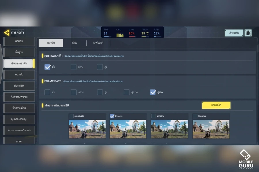 สำหรับการทดสอบ Samsung Galaxy A35 5G สามารถปรับกราฟิกได้ตั้งแต่ระดับ ต่ำ, กลาง และสูง แต่ถ้าอยากได้เฟรมเรตสูงสุดจะปรับได้ที่กราฟิก "ต่ำ" ครับ