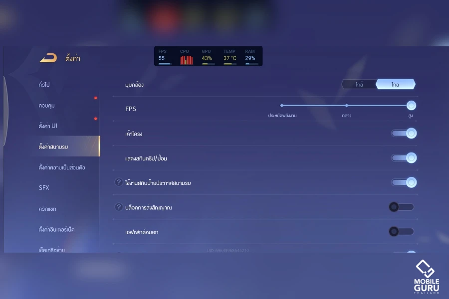 สำหรับ Samsung Galaxy A55 5G ตอนนี้จะปรับกราฟิกได้เพียงแค่ระดับ "ต่ำ" ครับ และเฟรมเรตจะปรับได้ที่ "สูง" ซึ่งจะได้ FPS อยู่ที่ประมาณ 60fps ในโหมด Multiplayer แต่จะได้ 40fps ในโหมด Battle Royale ครับ