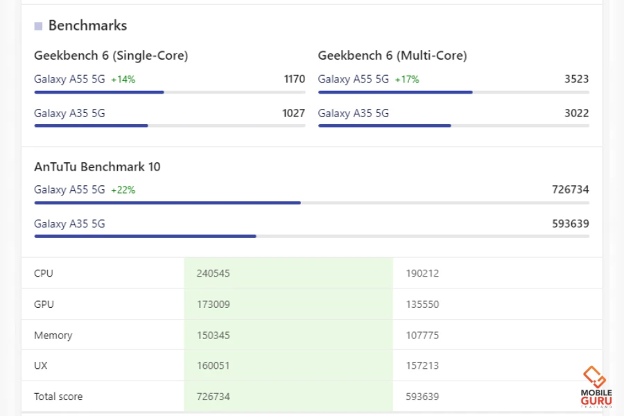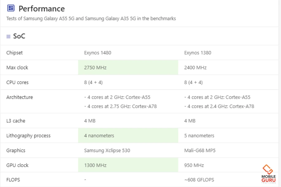ส่วน Samsung Galaxy A55 5G จะใช้ชิปตัวใหม่ Exynos 1480 (4nm), Octa-core (4x2.75 GHz Cortex-A78 & 4x2.0 GHz Cortex-A55), GPU: Samsung Xclipse 530, 1300 MHz ครั้งนี้พิเศษที่มีการไปจับมือกับทาง AMD เพื่อมาร่วมพัฒนาการ์ดจอ เหมือนกับชิป Exynos 2400 ด้วย