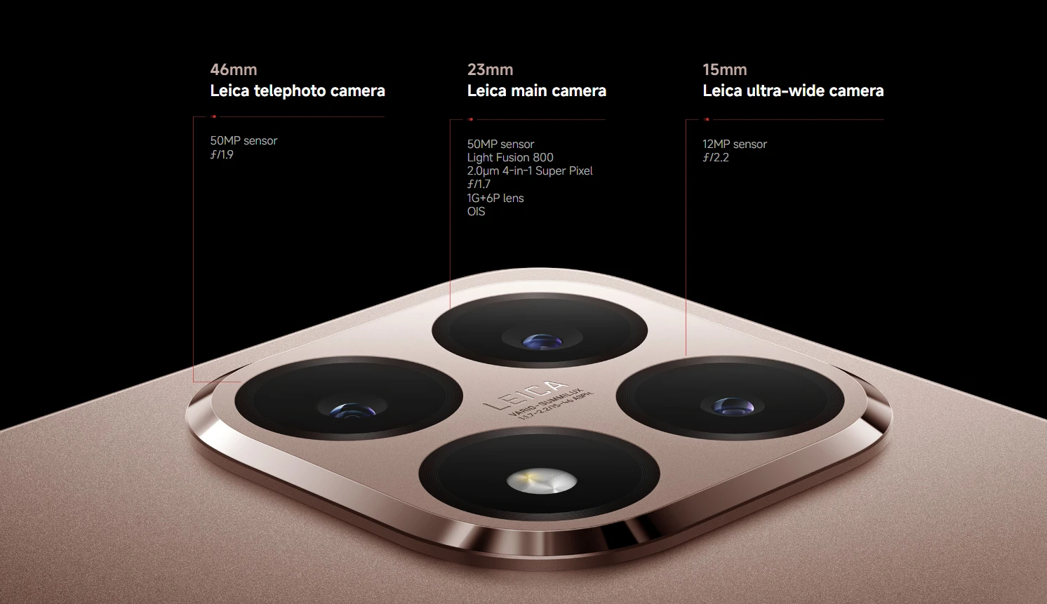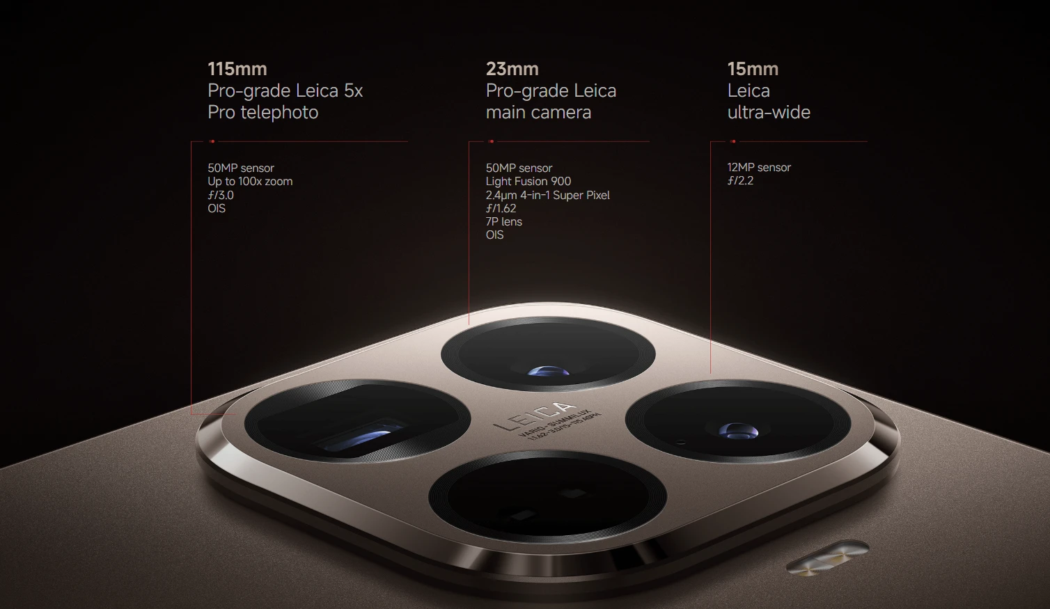 - กล้องหลัง: Leica Summilux เซนเซอร์ Light Fusion 900 ความละเอียด 50MP f/1.6 + Ultrawide 12MP f/2.2 + Telephoto (5x) เซนเซอร์ JN5 50MP f/3