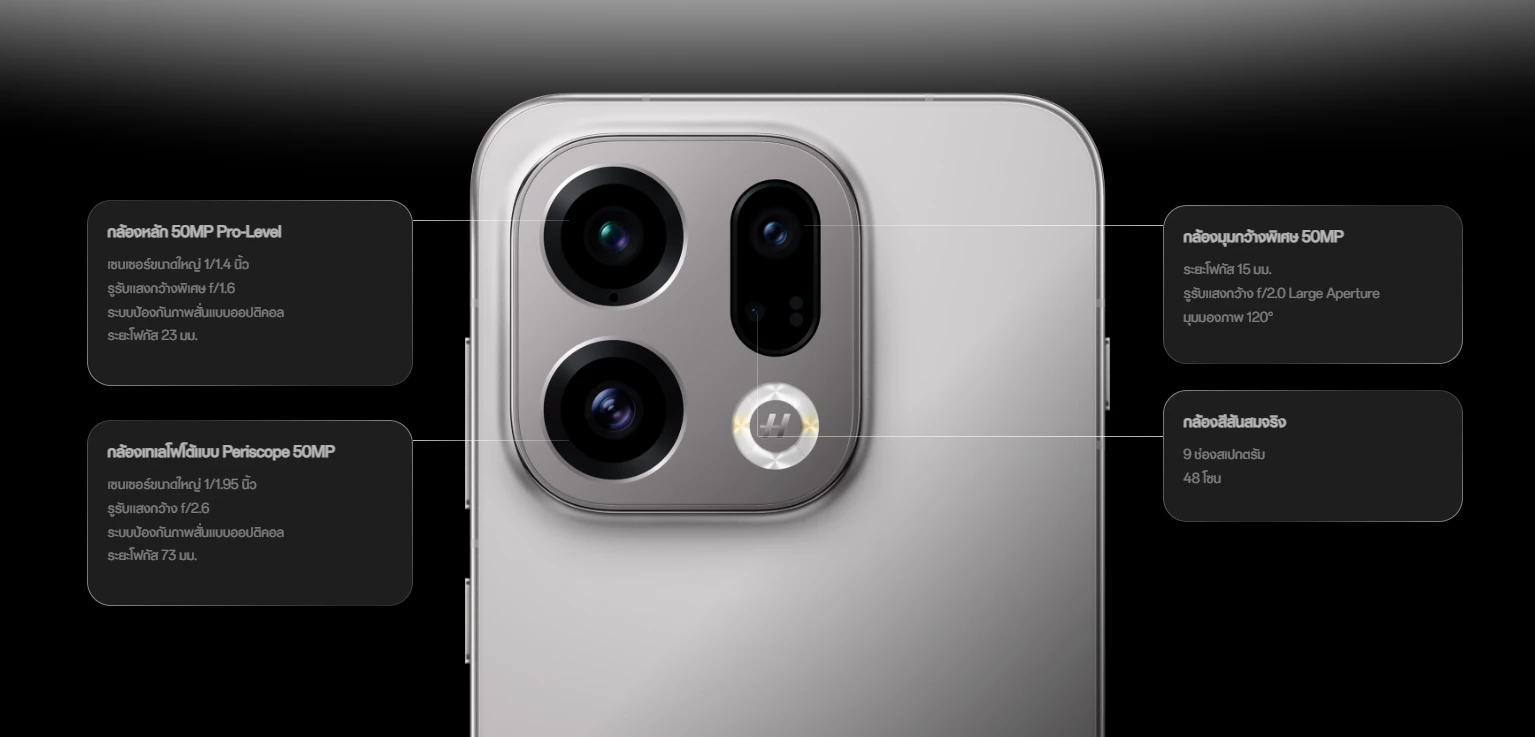 - กล้องหลัง: Hasselblad 50MP f/1.6, OIS + Ultrawide 50MP f/2.0 + Periscope Telephoto 3x 50MP f/2.6, OIS