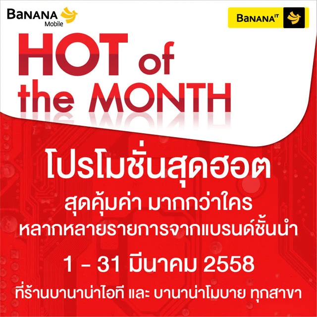โปรโมชั่น Hot of The Month ประจำเดือนมีนาคมนี้ ต้อนรับหน้าร้อนที่กำลังจะมาถึง กับสินค้าไอทีราคาสุดพิเศษหลายแบรนด์ชั้นนำที่ให้คุณเป็นเจ้าของได้ง่ายๆ ทั้งโน้ตบุ๊ค, อุปกรณ์คอมพิวเตอร์ประกอบ, สมาร์ทโฟน,และสินค้า Accessory บันเทิงใจ สบายกระเป๋า พร้อมรับส่วนลด สดๆร้อนๆ ไปเลย กับโปรโมชั่นดีๆ ที่ร้านบานาน่าไอที และร้านบานาน่าโมบาย ทุกสาขา ทั่วประเทศ ตั้งแต่วันที่ 1 มีนาคม - 31 มีนาคม 2558