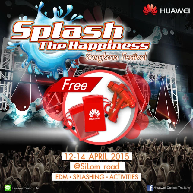บริษัท หัวเว่ย คอนซูมเมอร์ บิสสิเนสกรุ๊ป (ประเทศไทย) จำกัด ผู้ผลิตแอนดรอยด์สมาร์ทโฟนอันดับ 2 ของโลก ใจป้ำจัดใหญ่กิจกรรมส่งความสุขต้อนรับเทศกาลสงกรานต์บนถนนสีลมให้แฟนๆได้เล่นน้ำดับร้อนอย่างสนุกสนาน พร้อมรับฟรี! ปืนฉีดน้ำและซองกันน้ำหัวเว่ยสุดเท่ ให้มือถือคุณปลอดภัยไม่เปียกน้ำ และยังมีของที่ระลึกอื่นๆ อีกมากมาย ณ บริเวณหน้าอาคารยูไนเต็ดเซ็นเตอร์ ถนนสีลม