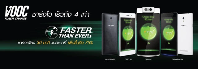 บริษัท ไทย ออปโป้ จำกัด ผู้จำหน่ายสมาร์ทโฟนสุดล้ำ OPPO และผู้นำนวัตกรรมชาร์จเร็ว VOOC Flash Charge ได้คิดค้น และพัฒนาเทคโนโลยี VOOC Flash Charge ชาร์จไวเร็วกว่าสมาร์ทโฟนทั่วไป 4 เท่า โดยสุดยอดนวัตกรรมชาร์จเร็วนี้อยู่ใน OPPO รุ่น Find7, Find7a, R5 และ N3 ซึ่งล้วนเป็นสุดยอดสมาร์ทโฟน โดย VOOC Flash Charge สามารถชาร์จแบตเร็ว ได้ถึง 75% ภายใน 30 นาที ไร้กังวลกับปัญหาแบตเตอรี่หมดระหว่างวัน ช่วยยืดการใช้งานช่วงเวลาสำคัญ ไม่ว่าขณะที่ใช้งาน Social Network, Application หรือแม้แต่เวลา Selfie อีกทั้งยังสามารถตอบสนองไลฟ์สไตล์ของผู้ใช้สมาร์ทโฟนในปัจจุบันได้อย่างดี