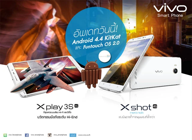 vivo Service (Thailand) Co., Ltd. ได้มีการปล่อยให้อัปเดตระบบปฏิบัติการ Android และ Funtouch OS แก่สมาร์ทโฟน vivo Xplay3S และ vivo Xshot โดยทั้ง 2 รุ่นนั้นจะทำการอัปเดตระบบจาก Android 4.3 Jelly Bean เป็น Android 4.4.2 Kitkat และ Funtouch OS 1.0/1.2 เป็น Funtouch OS 2.0 ตามลำดับ (ก่อนการอัปเดตระบบควรสำรองข้อมูลไว้ก่อน แบตเตอรี่ต้องมากกว่า 70% และควรถอดเมมโมรี่การ์ดออกจากเครื่องเพื่อป้องกันความเสียหายต่อข้อมูล)