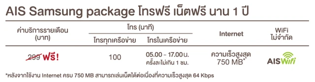 - รับฟรี! ค่าบริการรายเดือนนาน 1 ปีเต็ม ลูกค้าใหม่และลูกค้าปัจจุบันแบบรายเดือน รับทันที AIS Samsung Package โทรฟรี เน็ตฟรี (Non-Stop) นาน 12 เดือน