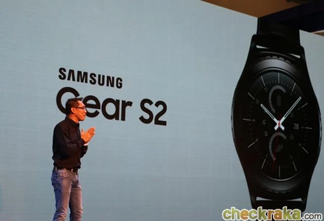 "อีกหนึ่งผลิตภัณฑ์ที่โดดเด่นไม่แพ้กันคือ Samsung Gear S2 อุปกรณ์อัจฉริยะสวมใส่ได้รุ่นล่าสุด ที่มาพร้อมขอบหน้าปัดดีไซน์กลมที่หมุนได้ มีให้เลือกด้วยกันสองรุ่นคือ รุ่นคลาสสิกและรุ่นสปอร์ต ซึ่งสามารถถอดเปลี่ยนหน้าปัดและสายข้อมือได้หลากสไตล์ตามความต้องการ โดย Samsung Gear S2 สามารถรับ กดอ่านและโต้ตอบกับข้อความต่างๆ ได้ นอกจากนี้ยังจับการเคลื่อนไหวตลอดทั้งวันขณะที่สวมใส่ ไม่ว่า ยืน เดิน นั่ง หรือ ออกกำลังกาย รวมไปถึงการวัดอัตราการเต้นของหัวใจ โดยซัมซุงเปิดให้สั่งจองในราคา 11,900 บาท สำหรับรุ่นคลาสสิก และ 9,900 บาท สำหรับรุ่นสปอร์ต พร้อมรับส่วนลด 1,000 บาทในงานนี้เท่านั้น นอกจากนี้ยังมี ซัมซุง กาแลคซี่ โน้ต 5 สีดำ (รุ่น 32 กิกะไบต์) ที่จะวางจำหน่ายในราคา 25,900 บาท พร้อมของสมนาคุณกว่า 3,000 บาท"