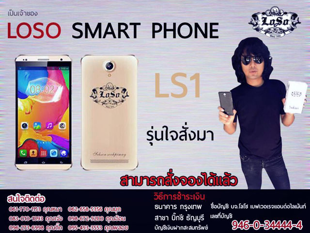 หลังจากที่ "เสกสรรค์ ศุขพิมาย" หรือ "เสก โลโซ" ประกาศจะทำโทรศัพท์มือถือภายใต้แบรนด์ "LOSO" ในราคาที่ไม่สูงมากออกวางจำหน่าย ล่าสุดทางเฟซบุ๊กแฟนเพจของพี่เสก โลโซ ก็ได้มีการประกาศเปิดให้จองโทรศัพท์มือถือ "LOSO Smartphone LS1" เรียบร้อยแล้วในราคา 3,500 บาท บวกค่าส่ง EMS อีก 50 บาท แฟนๆ คนไหนอยากได้ ก็รีบไปจับจองกันด่วนเลย โดยโทรตามเบอร์โทรศัพท์ที่เห็นนี้!!!