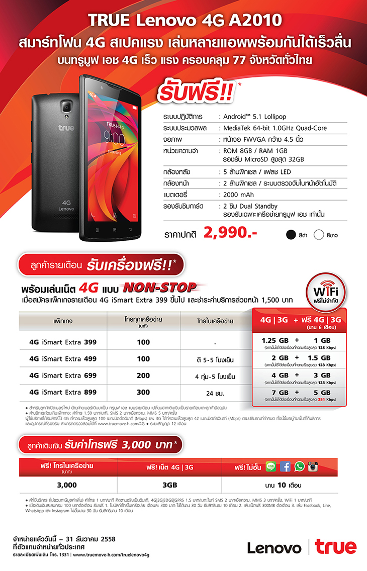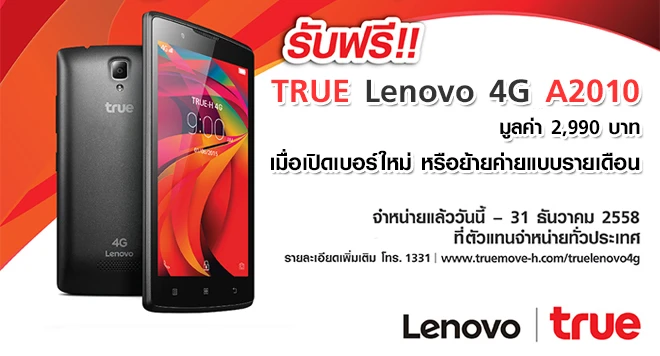 เลอโนโว ร่วมกับ ทรู เปิดตัว "True Lenovo 4G A2010" สมาร์ทโฟนสเปคแรงพร้อมเล่นเน็ต 4G ความเร็วไร้ขีดจำกัด ให้ลูกค้าได้สัมผัสประสบการณ์ 4G ที่เร็วสุด แรงสุด บนเครือข่ายทรูมูฟ เอช 4G ที่ใช้ได้จริงครอบคลุม 77 จังหวัดทั่วไทย พร้อมเสนอโปรโมชั่นสุดพิเศษเพื่อเอาใจลูกค้าทรูมูฟ เอช โดยเฉพาะ เพียงเปิดเบอร์ใหม่, ย้ายค่ายเบอร์เดิม หรือเปลี่ยนจากระบบเติมเงินเป็นระบบรายเดือน รับฟรี True Lenovo 4G A2010 มูลค่า 2,990 บาท เมื่อสมัครแพ็กเกจรายเดือน 4G iSmart Extra 399 ขี้นไป สำหรับการใช้บริการต่อเนื่องนาน 12 เดือน และชำระค่าบริการล่วงหน้า 1,500 บาท รับส่วนลดค่าใช้บริการเดือนละ 150 บาท นาน 10 เดือน