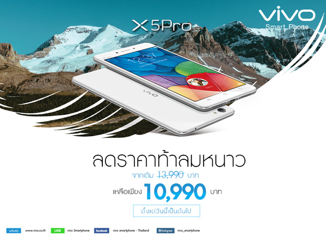 ตัวแรกคือ vivo X5Pro สมาร์ทโฟนสุดทันสมัย ด้วยตัวเครื่องสุดสวยงาม รองรับการใช้งานอย่างครบครันทั้งกล้องคุณภาพขนาด 13 ล้านพิกเซล ให้ภาพคมชัดและลูกเล่นต่างๆ ช่วยคุณสร้างสรรค์การถ่ายภาพได้หลากหลายรูปแบบ พร้อมกล้องหน้าขนาด 8 ล้านพิกเซล นอกจากถ่ายภาพแล้วสเปคเครื่องก็ยังรองรับการใช้งานได้ทุกรูปแบบผ่านหน่วยประมวลผล Qualcomm Snapdragon 615 ความเร็ว 1.7 GHz / ROM 16GB / ROM 2GB รองรับการใช้งาน 2 ซิมการ์ดและสามารถใช้สลับการ์ด Micro SD สูงสุด 128 GB พร้อมระบบเสียง Hi-Fi ให้คุณดื่มด่ำกับเพลงโปรดของคุณได้อย่างสุนทรีย์ โดย vivo X5Pro จะลดราคาทันที 3,000 บาท จาก 13,990 บาท เหลือเพียง 10,990 บาท