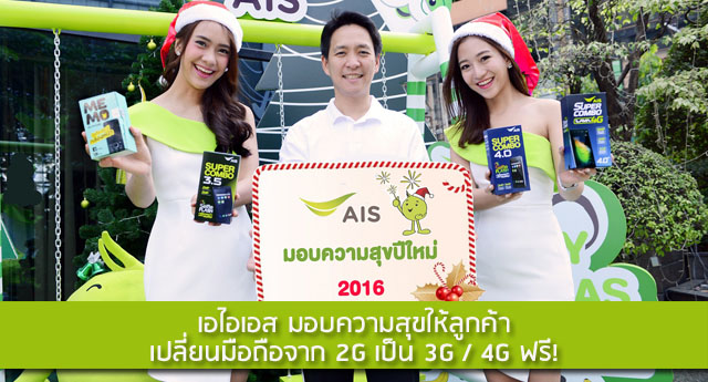 เอไอเอส โดย นายปรัธนา ลีลพนัง รองกรรมการผู้อำนวยการสายงานการตลาด มอบความสุขให้ลูกค้าทั่วประเทศ ต้อนรับเทศกาลปีใหม่ที่กำลังจะมาถึง เริ่มจากการให้ลูกค้าที่ใช้มือถือ 2G และมีการใช้งานจนถึงวันนี้ เอไอเอสพร้อมจะอัพเกรดเครื่องให้ลูกค้าจากเครื่อง 2G เป็นเครื่อง 3G หรือ 4G ฟรี โดยลูกค้าจะได้รับข้อความ SMS เรียนเชิญจากเอไอเอส หรือสามารถกดเช็คสิทธิ์ด้วยตนเองได้ง่ายๆ เพียงกด *999 # แล้วโทรออก โดยเอไอเอสมีเครื่องให้ลูกค้าเลือกหลากหลายรุ่น ทั้งเครื่องฟีเจอร์โฟนแบบปุ่มกด, เครื่องสมาร์ทโฟน 3G ขนาด 3.5 นิ้ว และสมาร์ทโฟน 3G ขนาด 4 นิ้ว รวมทั้งสมาร์ทโฟน 4G โดยการเลือกแต่ละรุ่นจะเติมเงินแตกต่างกัน เริ่มต้นที่ 100 บาท และเงินทุกบาทจะกลับไปอยู่ในมือถือของลูกค้า โดยลูกค้าระบบเติมเงินจะสามารถนำเงินที่เติมไปใช้งานได้ทั้งหมดทันที ส่วนลูกค้าระบบรายเดือน จำนวนเงินที่ลูกค้าเติมจะถูกหักออกจากใบแจ้งหนี้ตามการใช้งาน จนกว่าจะครบจำนวน
