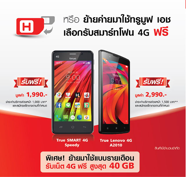 ทรูมูฟ เอช เร็ว แรง ครบทุกคลื่น 900 I 850 I 1800 I 2100MHz ใช้ได้ทุกเครื่อง ครอบคลุมทั่วไทย ปล่อยโปรโมชั่นแบบจัดเต็มให้ผู้ใช้เครื่อง 900MHz ไม่ต้องกลัวซิมดับ ไม่ต้องกลัวมือถือจะใช้งานไม่ได้ ย้ายค่ายมาทรูมูฟ เอช แบบเติมเงิน รับมือถือฟรี และซิมฟรี รับส่วนลดค่าโทรและค่าเน็ต 50% เพียงเพิ่มความคุ้มค่ายิ่งขึ้นกับ "โปรย้ายค่ายได้ 3 ต่อ" ได้แก่ ฟรีเน็ต 1 GB ฟรี WiFi ไม่อั้น และฟรี True Point 300 คะแนน ใช้แทนเงินสดแลกซื้อสินค้าใน 7- Eleven มูลค่า 30 บาท ผู้ที่สนใจย้ายค่ายเบอร์เดิมมาเร็วแรง กับทรูมูฟ เอช 4G ได้แล้ววันนี้ ที่ทรูช้อป ตัวแทนจำหน่ายที่ร่วมรายการ ร้าน 7-Eleven ทั่วประเทศ เพียงแสดงบัตรประชาชนเท่านั้น ตั้งแต่วันนี้ถึง 31 มีนาคม 2559