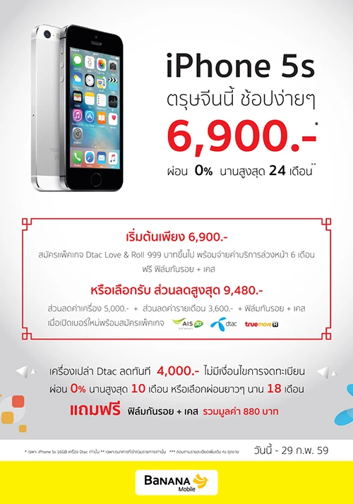 - รับฟรี ของแถมพรีเมี่ยม มูลค่าสูงสุด 2,780 บาท (เฉพาะสินค้าที่ร่วมรายการ) - iPhone 5s ใช้งานง่าย ได้ส่วนลดสูงสุด 8,880 บาท เริ่มต้นเพียง 715.-/ เดือน