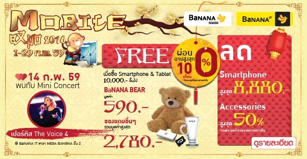 มอบความสุข สุด เฮง เฮง เฮง ต้อนรับเทศกาลตรุษจีนกับสินค้าไอทีคุณภาพ จากหลากหลายแบรนด์ชั้นนำ ที่ร้านบานาน่าไอที และบานาน่าโมบาย ทั่วประเทศ ตั้งแต่วันที่ 1 - 29 กุมภาพันธ์ 2559