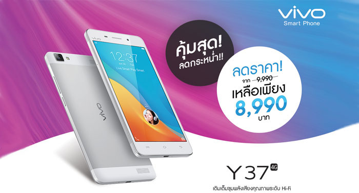 ใครกำลังมองหาสมาร์ทโฟนคุณภาพยอดเยี่ยม ราคาคุ้มค่า เพื่อเป็นของขวัญสุดพิเศษให้เป็นรางวัลแก่ตัวเองหรือคนที่รัก vivo Smartphone ขอมอบโอกาสสุดคุ้มปรับลดราคาสมาร์ทโฟนสุดโดนใจกับรุ่น Y37 จากเดิมราคา 9,990 บาท เหลือเพียง 8,990 บาท