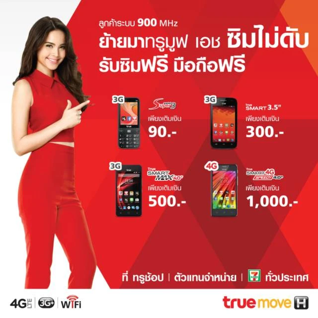 ทรูมูฟ เอช เร็ว แรง ครบทุกคลื่น 900 I 850 I 1800 I 2100 MHz ใช้ได้ทุกเครื่อง ครอบคลุมทั่วไทย ชวนลูกค้าผู้ใช้เครื่อง 900 MHz ไม่ต้องกลัวซิมดับ ไม่ต้องกลัวมือถือจะใช้งานไม่ได้ ย้ายค่ายมาทรูมูฟ เอช แบบเติมเงิน รับมือถือฟรี และซิมฟรีได้แล้ววันนี้ ที่ทรูช้อป ตัวแทนจำหน่ายที่ร่วมรายการ ร้าน 7-Eleven ทั่วประเทศ เพียงแสดงบัตรประชาชนเท่านั้น