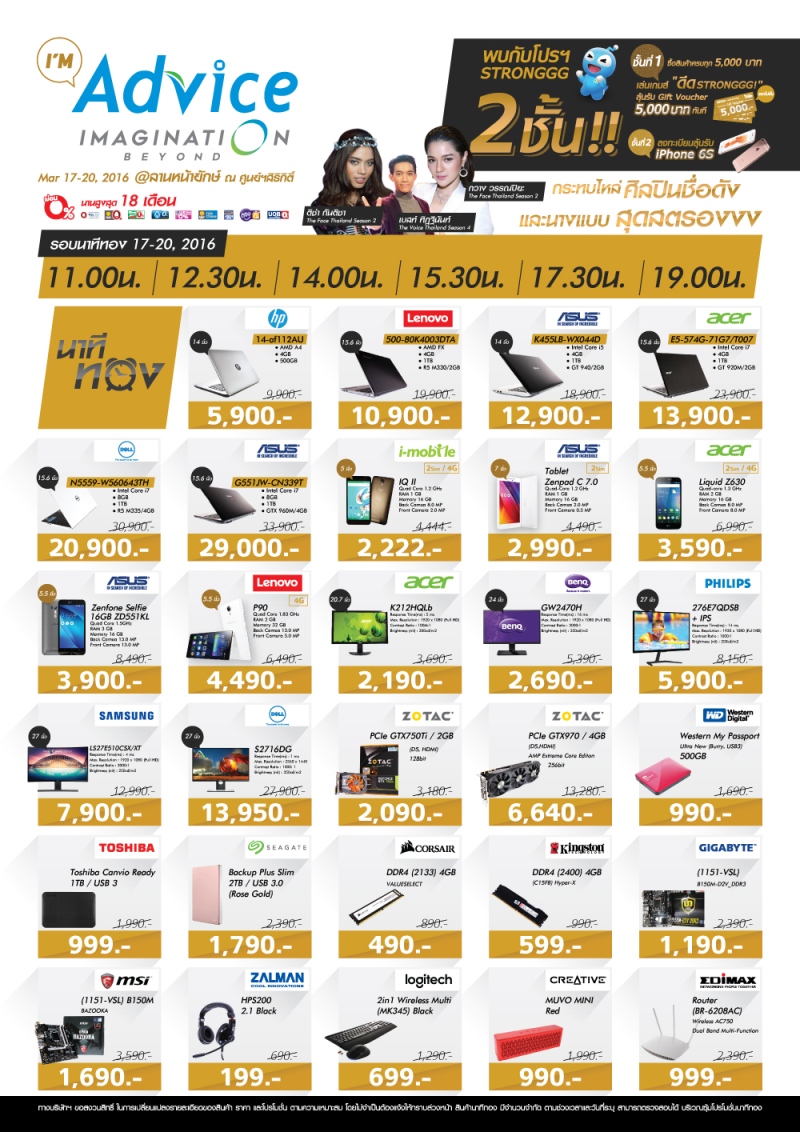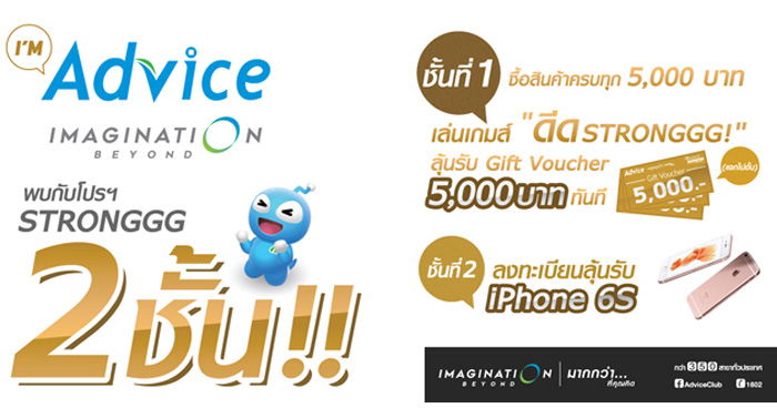 แอดไวซ์ (Advice) แหล่งรวมสินค้าไอที และสมาร์ทโฟนรายใหญ่ ที่มีเครือข่ายครอบคลุมกว่า 350 สาขาทั่วประเทศไทย จัดโปรโมชั่นพิเศษต้อนรับงาน Commart Connect 2016 ที่จัดขึ้นระหว่างวันที่ 17 - 20 มีนาคม ณ ลานหน้ายักษ์ ศูนย์ประชุมแห่งชาติสิริกิติ์ เนรมิตพื้นที่กว่า 400 ตร.ม. ภายใต้คอนเซ็ปต์ "I'm Advice Imagination Beyond" เพราะเราคือแอดไวซ์ มากกว่าที่คุณคิด ขนสินค้าไอที คอมพิวเตอร์ D.I.Y. โน๊ตบุ๊ค สมาร์ทโฟน ไลฟ์สไตล์และอุปกรณ์เสริมกว่า 10,000 รายการ มาลดกระหน่ำสูงสุด 80% พิเศษ! แอดไวซ์จัด "โปรโมชั่น STRONGGG 2 ชั้น" ซื้อสินค้าครบ 5,000 บาท รับสิทธิเล่นเกมดีด STRONGGG! ลุ้นรับ Gift Voucher มูลค่า 5,000 บาท ที่นำมาแจกกันแบบไม่อั้น พร้อมยังได้ลุ้นอีกต่อกับโทรศัพท์มือถือ iPhone 6s อีกด้วย