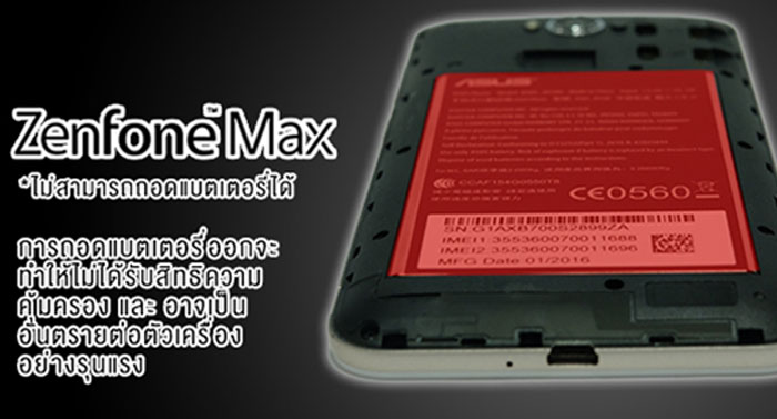 - ผลิตภัณฑ์โทรศัพท์มือถือ ASUS Zenfone Max ได้รับการออกแบบให้ผู้ใช้ไม่สามารถถอดแบตเตอรี่ได้ด้วยตนเอง เนื่องจากแบตเตอรี่ได้รับการยึดไว้ทั้งสองด้านของกรอบเครื่อง