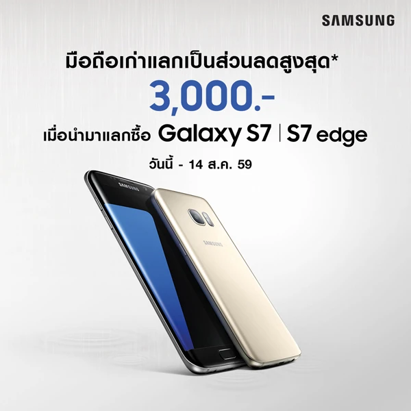 กลับมาอีกครั้ง กลับโปรโมชั่นดีๆ จาก ซัมซุง ที่จัดโปรโมชั่นต้อนรับหน้าฝน โดยให้นำสมาร์ทโฟนหรือแท็บเล็ตรุ่นใดก็ได้ มาแลกรับส่วนลดมูลค่า 3,000 บาท เมื่อซื้อ Samsung Galaxy S7 ในราคา 20,900 บาท จากราคาแนะนำปกติ 23,900 บาท และ Samsung Galaxy S7 edge ในราคา 23,900 บาท จากราคาแนะนำปกติ 26,900 บาท ตั้งแต่วันนี้ - 14 ส.ค. 59 โทรศัพท์มือถือ 1 เครื่อง สามารถใช้สิทธิ์แลกรับส่วนลดได้เพียง 1 เครื่องเท่านั้น