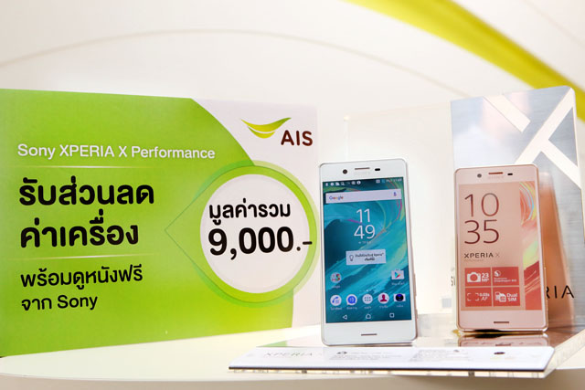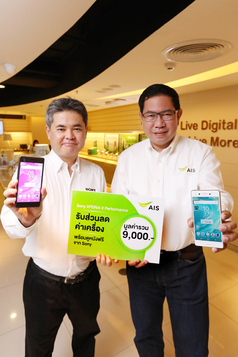 นายฐิติพงศ์ เขียวไพศาล ผู้ช่วยกรรมการผู้อำนวยการอาวุโส สายงานการตลาด เอไอเอส จับมือ มร. ยูโซะ ชิบะ กรรมการผู้จัดการ โซนี่ ไทย จำกัด นำนวัตกรรมสมาร์ทโฟนไฮเอนด์ เรือธง กล้องล้ำ ระดับ Masterpiece รุ่นใหม่ล่าสุด ตระกูล "SONY XPERIA X Series" จัดเต็มข้อเสนอพิเศษให้กับลูกค้าเอไอเอส ทั้งลูกค้าปัจจุบัน, เปิดเบอร์ใหม่, ย้ายค่ายเบอร์เดิม หรือเปลี่ยนจากเติมเงินเป็นรายเดือน ลดค่าเครื่องทันที พร้อมรับสิทธิ์ดูหนังฟรี! จากโซนี่ รวมมูลค่าสูงสุด 9,000 บาท เมื่อซื้อ "SONY XPERIA X Performance" เหลือเพียง 20,990 บาท (ราคาปกติ 25,990 บาท) และรุ่น "SONY XPERIA XA" เหลือเพียง 6,990 บาท (ราคาปกติ 9,900 บาท) พร้อมสมัครแพ็กเกจ "AIS Smart Deal" เล่นเน็ต 4G เต็มสปีด เริ่มต้นเพียง 488 บาท/เดือน