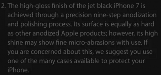 ซึ่งทาง Apple ก็ได้ออกมาเตือนตั้งแต่เนิ่นๆ ว่า สี Jet Black นั่นอาจจะทำให้เกิดเป็นรอยขีดข่วนที่เห็นได้ชัดได้ง่าย จำเป็นที่จะต้องระมัดระวังโดยต้องซื้อเคสมาใส่เพื่อป้องกันรอยขีดข่วนที่ตัวเครื่องไว้ ถึงแม้ว่าบางคนอาจจะไม่ค่อยอยากใส่เพราะจะทำให้ไม่เห็นสีของตัวเครื่องชัดเจนก็ตาม