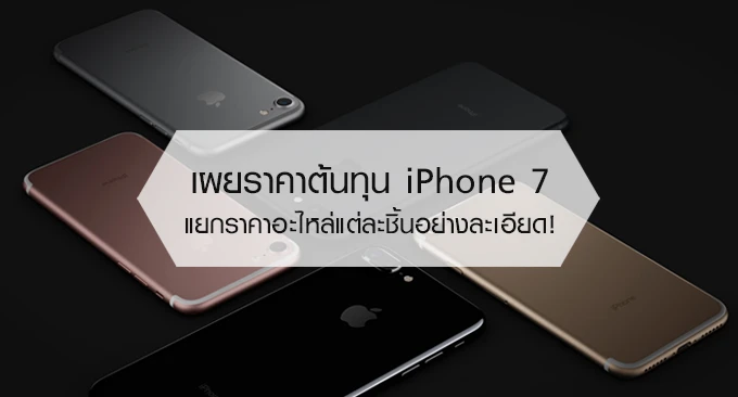iPhone 7 และ iPhone 7 Plus วางจำหน่ายในหลายๆ ประเทศแล้ว ส่วนบ้านเราก็อดใจรอกันอีกไม่นานแล้วนะครับ สำหรับทั้ง 2 รุ่นก็มีการอัพเกรดขึ้นมาเยอะทีเดียว ไม่ว่าจะคุณสมบัติป้องกันน้ำและฝุ่นระดับมาตราฐาน IP67, ชิปเซ็ตตัวใหม่ Apple A10, กล้องที่คุณภาพดีขึ้น, แบตเตอรี่ที่ใช้งานได้ยาวนานขึ้น (ความจุเพิ่มขึ้นเล็กน้อย...แบบยั่วยวนใจเหลือเกิน), ลำโพงสเตอริโอ, แต่ตัดช่องหูฟัง 3.5 มม. ออก (เพื่อเปิดช่องขายอุปกรณ์ไร้สาย) ทำให้หลายคนสงสัยว่าต้นทุนจริงๆ ของเจ้า iPhone 7 และ iPhone 7 Plus นั้นมีราคาเท่าไหร่ สมเหตุสมผลที่ Apple วางจำหน่ายในราคา $650 - $970 หรือเปล่า? ไม่ต้องเดาแล้วครับ วันนี้เรามีคำตอบมาฝากกัน