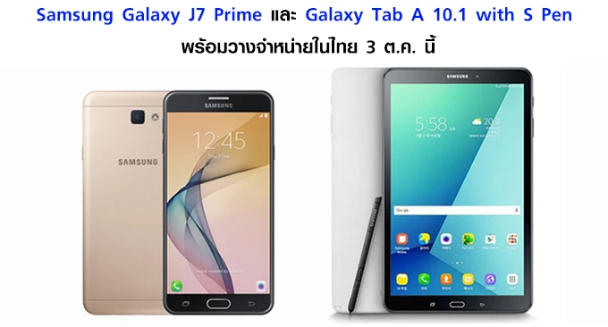 Samsung ประเทศไทย จะวางจำหน่ายสมาร์ทโฟนและแท็ปเล็ตรุ่นใหม่อย่าง Samsung Galaxy J7 Prime ในราคา 9,900 บาท และ Samsung Galaxy Tab A 10.1 with S Pen ในราคา 12,900 บาท โดยมีกำหนดวางจำหน่ายในประเทศไทยวันที่ 3 ตุลาคมนี้