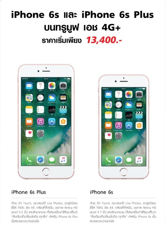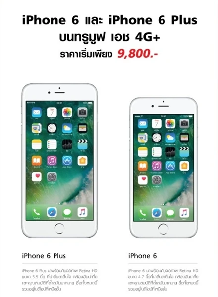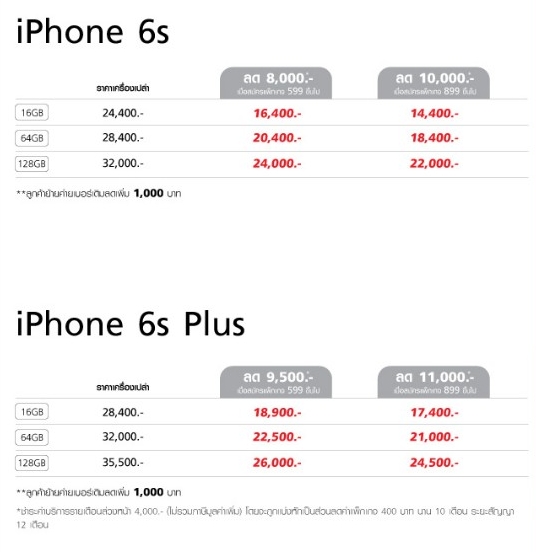 โดยเจ้าตัว iPhone 6s ให้ส่วนลดสูงสุดถึง 11,000 บาท หรือเริ่มต้นเพียง 14,400 บาท เท่านั้น และสำหรับลูกค้าย้ายค่ายเบอร์เดิมจะได้ส่วนลดเพิ่มอีก 1,000 บาท ซึ่ง iPhone 6s ส่วนลด 8,000 บาท เมื่อสมัครแพ็คเกจ 599 ขึ้นไป ส่วนลด 10,000 บาท เมื่อสมัครแพ็คเกจ 899 ขึ้นไป และสำหรับหรับรุ่น iPhone 6s Plus ลด 9,500 บาท เมื่อสมัครแพ็คเกจ 599 ขึ้นไป ส่วนลด 11,000 บาท เมื่อสมัครแพ็คเกจ 899 ขึ้นไป