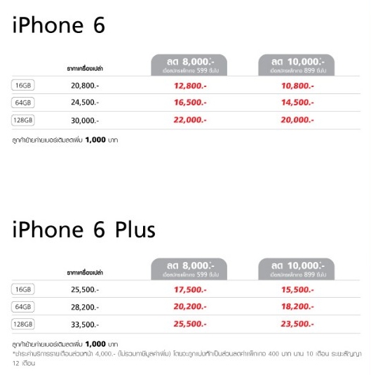 และรุ่น iPhone 6 ให้ส่วนลดสูงสุดถึง 10,000 บาท หรือเริ่มต้นเพียง 10,800 บาท เท่านั้น และสำหรับลูกค้าย้ายค่ายเบอร์เดิมจะได้ส่วนลดเพิ่มอีก 1,000 บาท ซึ่ง iPhone 6 ส่วนลด 8,000 บาท เมื่อสมัครแพ็คเกจ 599 ขึ้นไป ส่วนลด 10,000 บาท เมื่อสมัครแพ็คเกจ 899 ขึ้นไป และสำหรับหรับรุ่น iPhone 6 Plus ลด 8,000 บาท เมื่อสมัครแพ็คเกจ 599 ขึ้นไป ส่วนลด 10,000 บาท เมื่อสมัครแพ็คเกจ 899 ขึ้นไป
