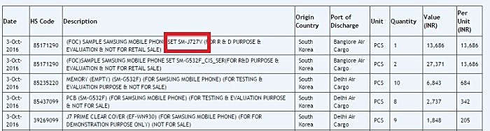 หลังจาก Samsung Galaxy J3 (2017) มีข้อมูลหลุดออกมาก่อนหน้านี้แล้วผ่าน TENAA ของประเทศจีนล่าสุดก็ถึงตาของ Samsung Galaxy J7 (2017) หลุดมาในรหัส SM-J727V ผ่านทาง Zauba เว็บไซต์นำเข้าส่งออกของประเทศอินเดีย